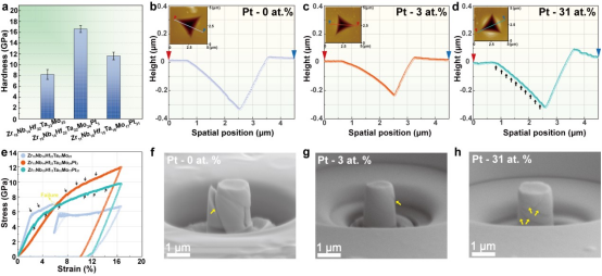 In this work, the severe-lattice-distorted crystalline Zr-Nb-Hf-Ta-Mo HEA is chosen as the base system; subsequently, utilizing the growth characteristics of co-sputtering, a typical “layer-by-layer” model based on “down-up” strategy, the high-negative-enthalpy foreign Pt atoms are continuously and uniformly introduced into growth front of Zr-Nb-Hf-Ta-Mo HEA, ensuring these Pt atoms atomically dispersed in the HEA lattice sites. The atomic-level intracrystalline Pt atoms may disturb the coordination of surrounding atoms and form favorable Pt-Zr pair due to its ΔHmix up to -100 kJ/mol, further triggering local disorder surrounding Pt atoms when the highly negative enthalpy encounters with inherent severe lattice distortion. As a result, based on an enthalpy-guided strategy, Pt-Zr-enriched amorphous groups surrounding foreign Pt atoms successfully separate severe-lattice-distorted Zr-Nb-Hf-Ta-Mo grains into crystalline MRO, forming the paracrystalline HEA. The atomic-scale tailoring strategy of "high negative mixing enthalpy + severe lattice distortion" contributes to the simultaneous heterogeneous regulation of structural topology and chemical grouping at the sub-nanometer scale, which tuning the transition group heavy metal HEA with ordered structural topology into a novel HEA structure with sub-nanometer-scale paracrystals as a structural unit. Such a paracrystalline nanostructure bridges the gap between nanocrystalline and amorphous materials, suppressing the dislocation behavior of crystalline materials and avoiding the strong local shear deformation behavior of amorphous materials during the loading process, and enabling the material to achieve homogeneous plastic flow at the macroscopic scale. While doubling the hardness and compressive strength by 69.2%, the ultimate plastic deformation is significantly increased, providing a new design idea for the design of strong and tough integrated high entropy alloys. With a 100% and 69.2% increase in hardness and compressive strength, respectively, the limit plastic deformation is significantly increased, which provides a fruitful “menu option” for the design of HEA with strength-toughness synergy.