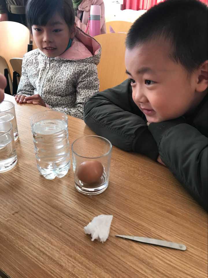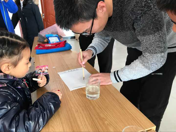 上午9:00活动正式开始,志愿者通过向小朋友们播放趣味性强且实验现象明显的科学实验视频集锦来极大地引起小朋友们对实验的兴趣。在接下来的实验演示过程中,在场的小朋友全神贯注地盯着志愿者的实验演示,认真聆听志愿者讲解原理,眼神里充满了好奇与兴奋。新颖绮丽的“水中悬蛋”、趣味十足的“水球的泳姿”、神奇有趣的“漂浮的针”、百思不解的“神奇墨水”等小实验,成功地吸引了小朋友们的眼球。在“神奇墨水”实验展示过程中,志愿者用毛笔蘸糖水在纸上写字,晾干后字迹消失,用打火机稍稍烤一烤,消失的字迹再次出现,并呈现浅褐色,字迹的神奇出现让小朋友们看得目瞪口呆,纷纷向志愿者们提出问题,并在志愿者的耐心引领下,进行了简单的实验操作。随后,在针对实验展开的科普知识竞答环节中,小朋友们认真听题,踊跃举手,积极抢答,表达自己对科学的独特理解与看法。上午10:00本次科普活动圆满结束!