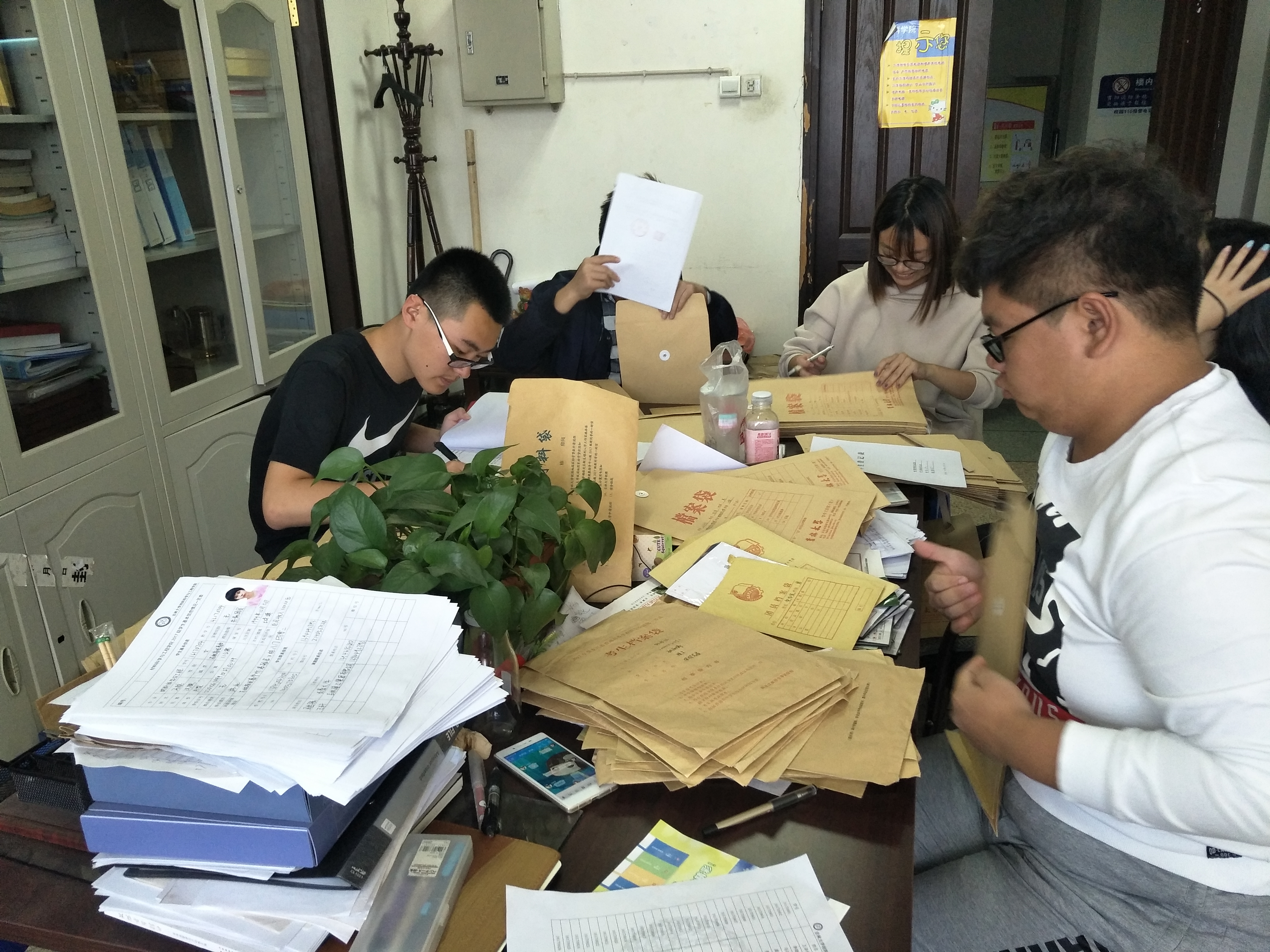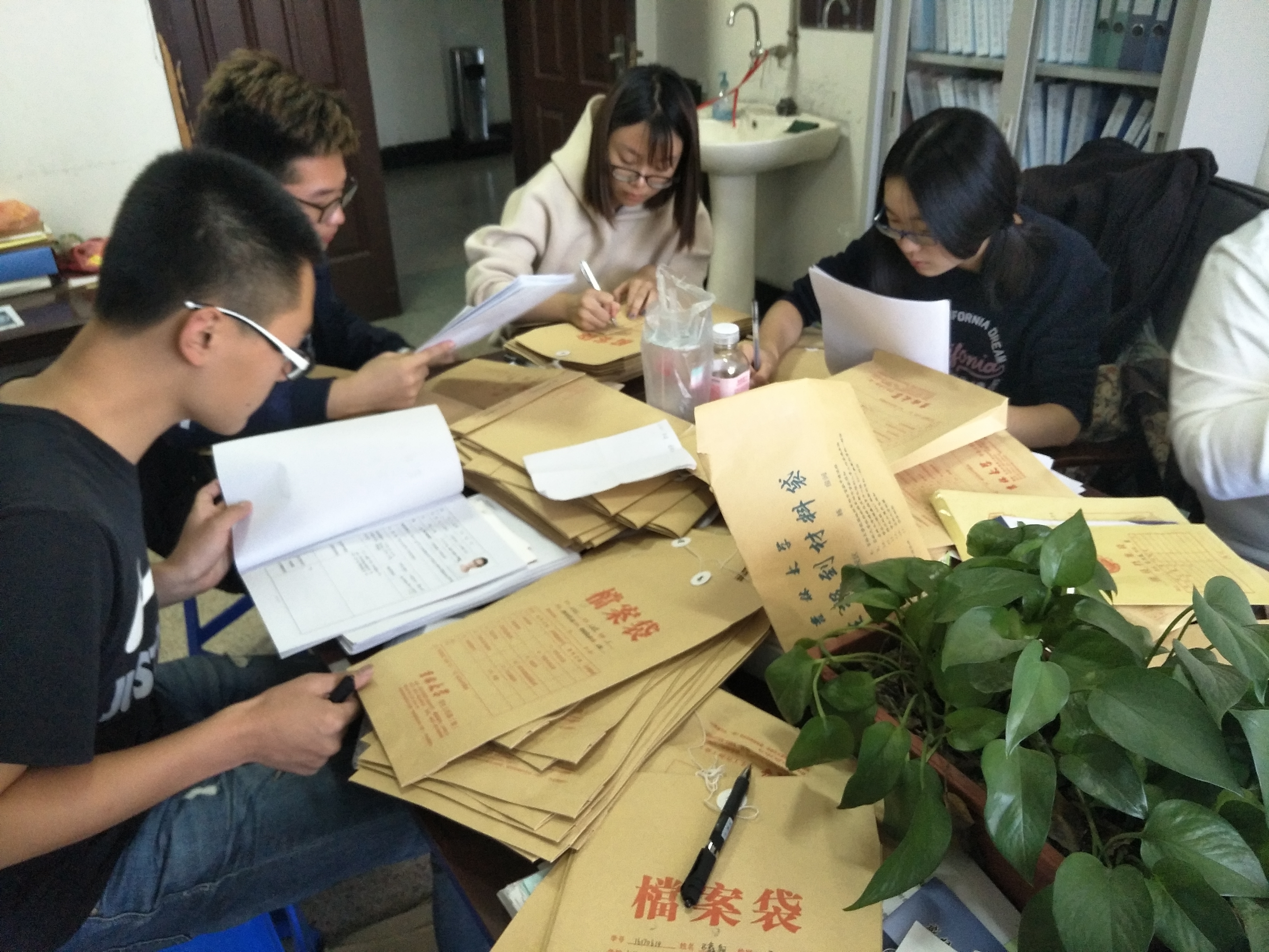 2017级辅导员杨超老师亲自为大家讲述了整理新生档案应注意的事项。其中包括:如何填写档案袋封面、如何检查新生资料是否齐全以及该把哪些资料放进档案袋。并要求各班主任助理把缺少部分资料或资料信息有问题的同学记录下来。杨超老师说完注意事项后,各班主任助理便迅速地投入到新生档案的整理中,负责每个班的两位班主任助理分工明确,其中一人负责新档案袋封面的填写,另一个负责检查新生资料并装进档案袋,以确保每一位同学的资料信息都是准确的、齐全的。在辅导员杨超老师严谨负责地带领下,在各班班主任助理认真积极地工作下,下午4:00,新生档案的整理工作顺利完成。