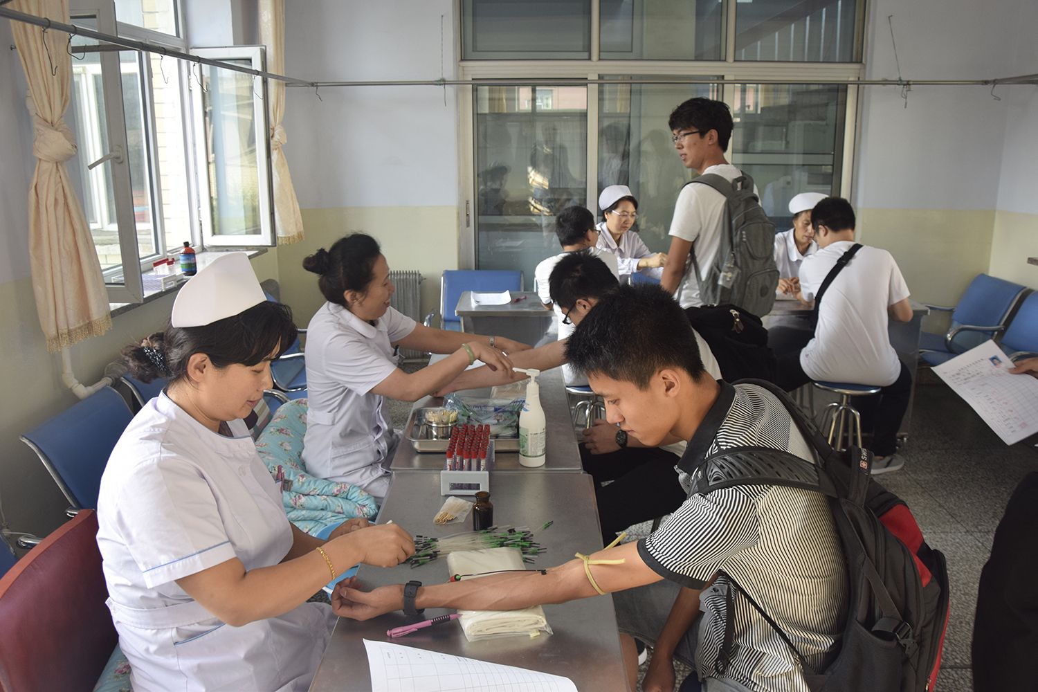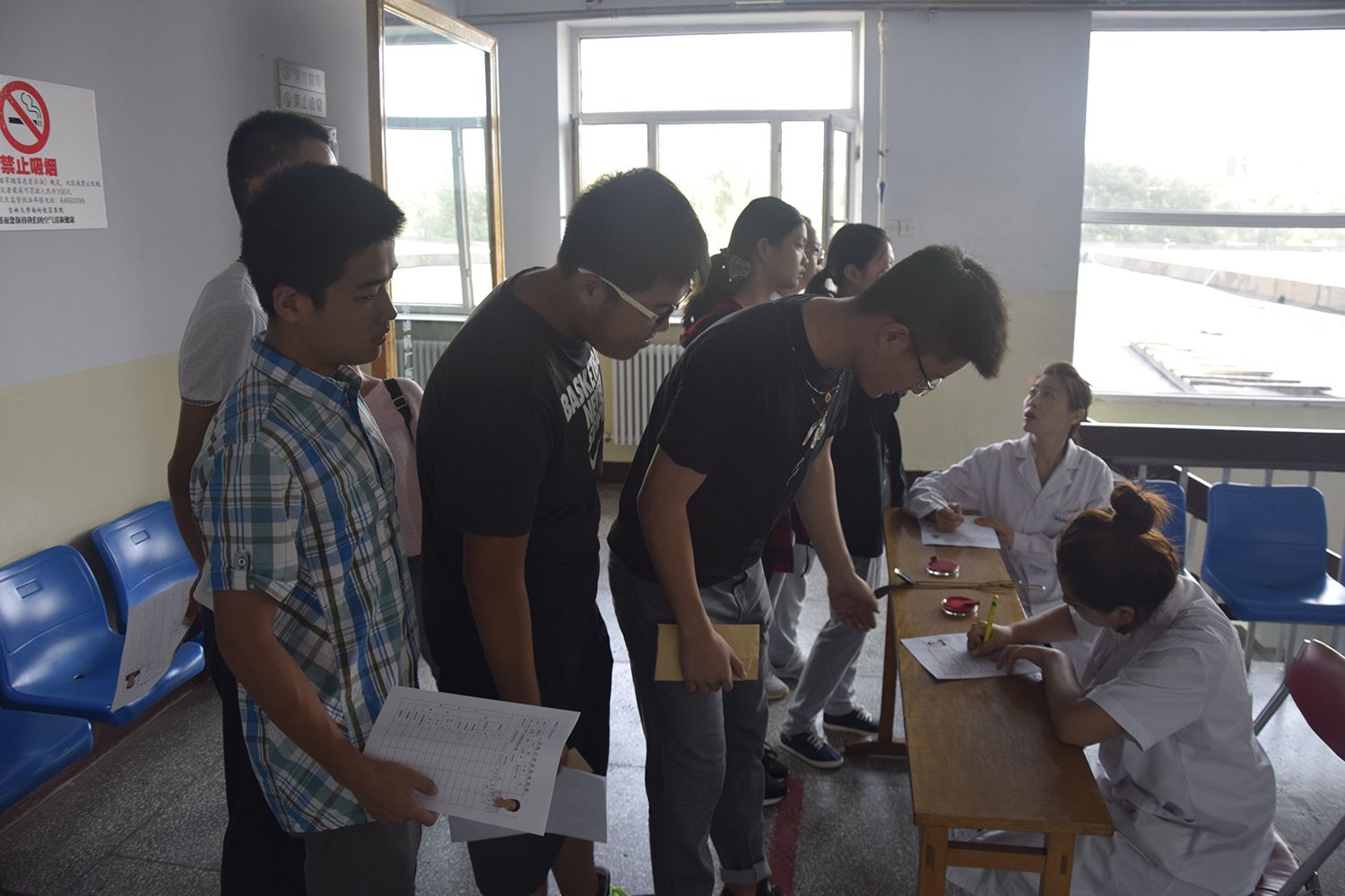 28日、29日上午8:00,全体新生于宿舍公寓楼下集合完毕,随后由辅导员助理及班主任助理带队前往校区医院接受体检。本次体检设有心压、心率、身高、体重、视力、听力、口腔、胸透等多个项目在学校的合理安排下,在医院医护人员的认真检查、辛苦付出下,在同学们的积极配合下,体检工作得以迅速有序的展开。上午11:30 新生们顺利地完成了所有的体检项目。
