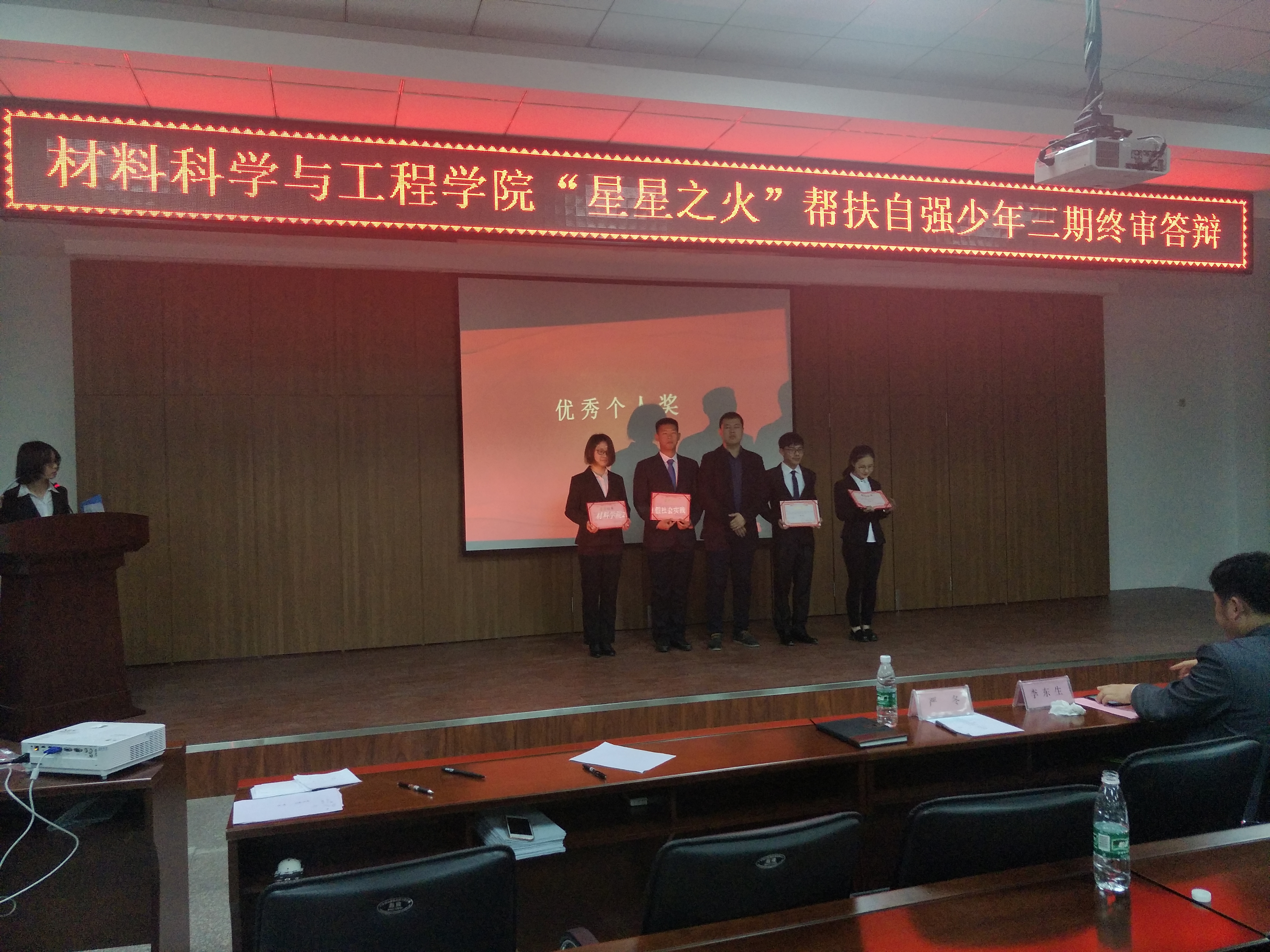 终审答辩大会伊始,主持人介绍与会嘉宾,播放阳光爱心学校宣传片。随后经过层层选拔的优秀个人和团体分别使用PPT对自身假期社会实践活动进行讲解,总结志愿服务经历,接受由李书记、严老师、阳光爱心学校副校长于奥博颁发的荣誉证书,并发表获奖感言,在大会尾声李书记结合同学们的经历以及自身看法分析了社会现象以及志愿服务类型,号召并鼓励同学们更加积极地投入到志愿服务活动中去。最终大会在全体成员的掌声中圆满结束。