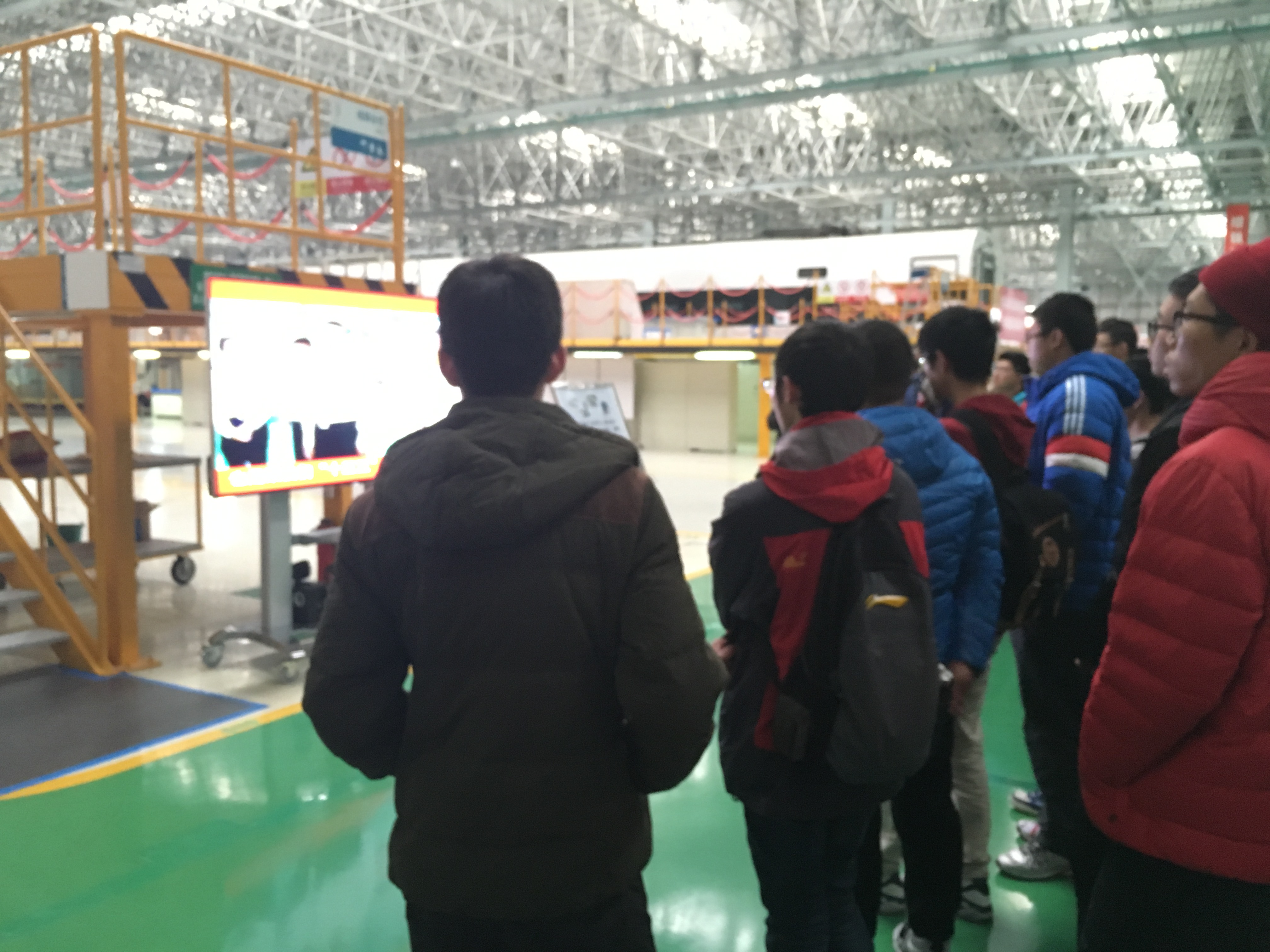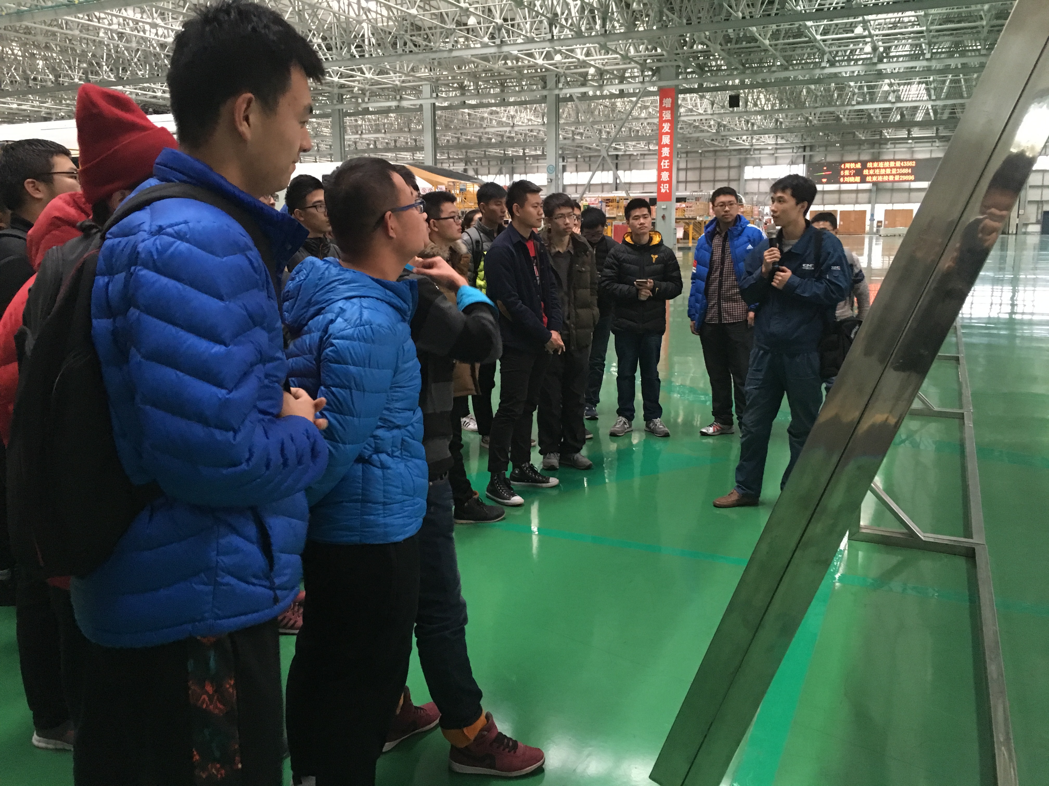 在工作人员的引领与介绍下,学生们进入到动车组转向架车间,深深地被这一世界领先的技术所吸引。在参观铝合金生产车间后,同学们来到高速动车组预装配车间。在车间中,他们注意到高高悬挂的各式标语,而其中一条为:“我们的价值观是——忠诚企业、爱岗敬业、全新进取、拼搏奉献、精湛技能、严实精细、一流操守、打造精品”。从一个企业对于员工的要求中可见,在校大学生只有不断充实发展完善自己,才能适应社会对人才的需要。离开预装配车间,同学们来到高速动车组总装配车间。明亮宽敞的车间、紧张繁忙的工作场景让材料学子对今后可能从事的行业有了一定了解。