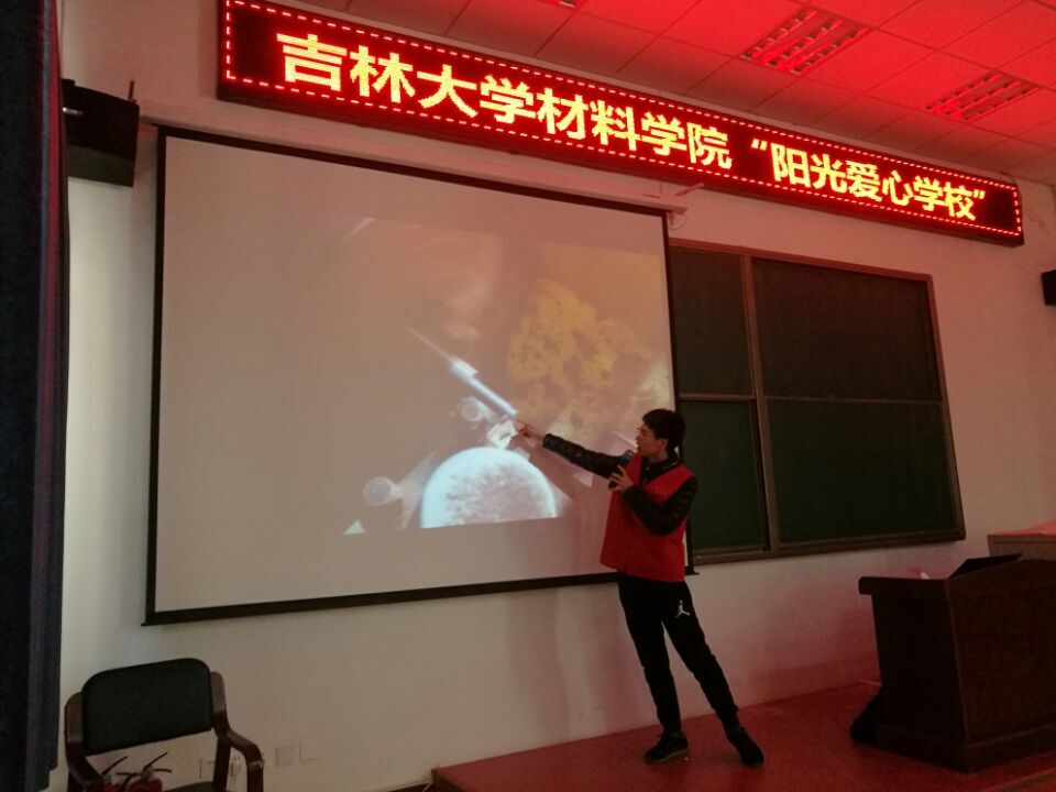 南岭工程训练的视频,让学生了解到大学里丰富的课程。在讲解过程中,副部长将精心准备的工图作业和亲手打磨的机械工件作为教具,更生动直接地让同学们了解工程实训。为了防止小学生在观看时受伤,这些教具由志愿者拿到学生身边依次展示。关于大学课余生活的介绍,志愿者简述了丰富多彩的社团活动、各类型有趣的比赛以及大学生合作完成的科技制造和创新产品,当志愿者向小朋友们展示了吉速车队的同学们合作完成的F1方程式赛车时,台下传来阵阵赞叹。课堂尾声,副部长对此次教学进行总结,他希望同学们在今后能合理安排时间,在认真学习课堂知识的同时,能利用课余时间来发展兴趣爱好,培养出自己的一技之长,成为对国家对社会有用的人。