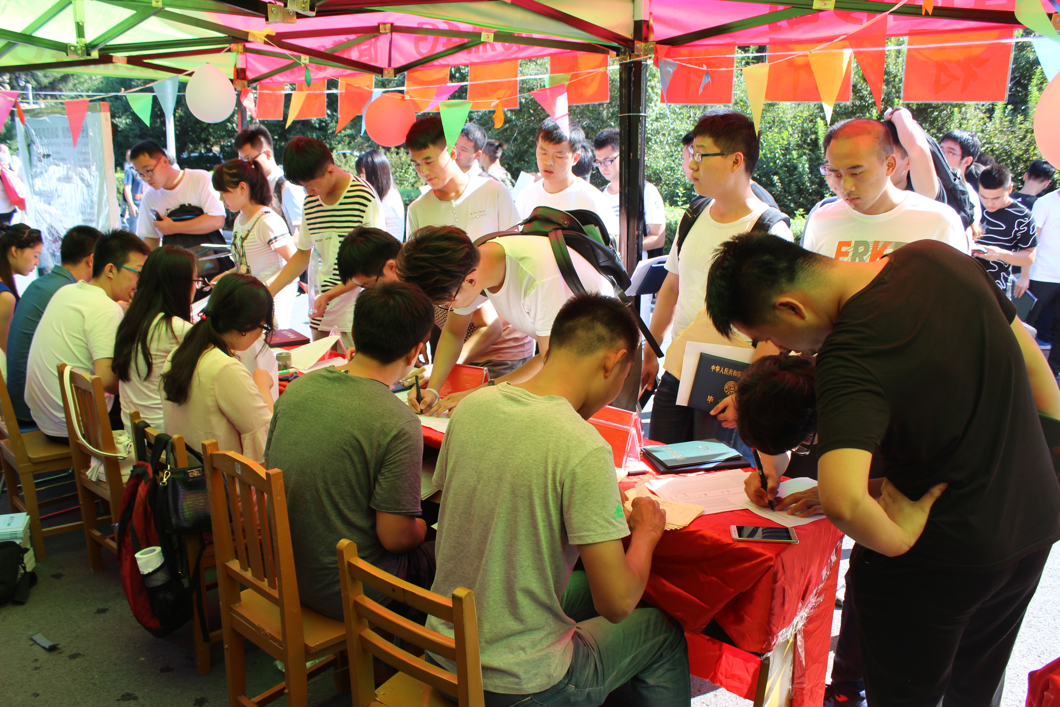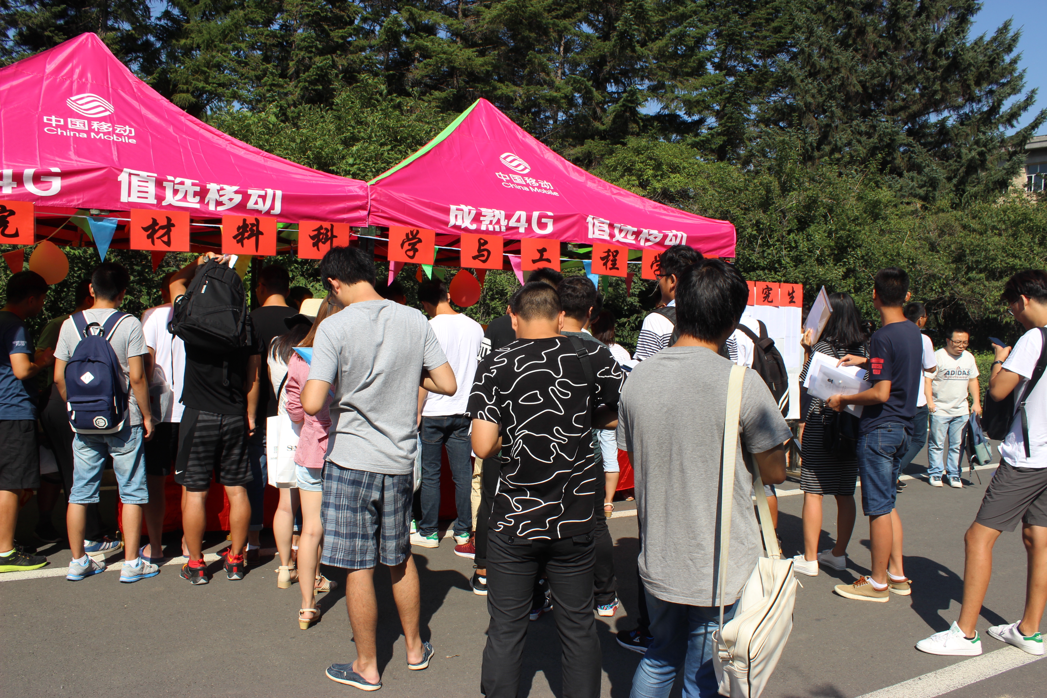 在第二教学楼前举行研究生迎新工作。来自全国各地的16级新同学陆续完成入学手续的办理。