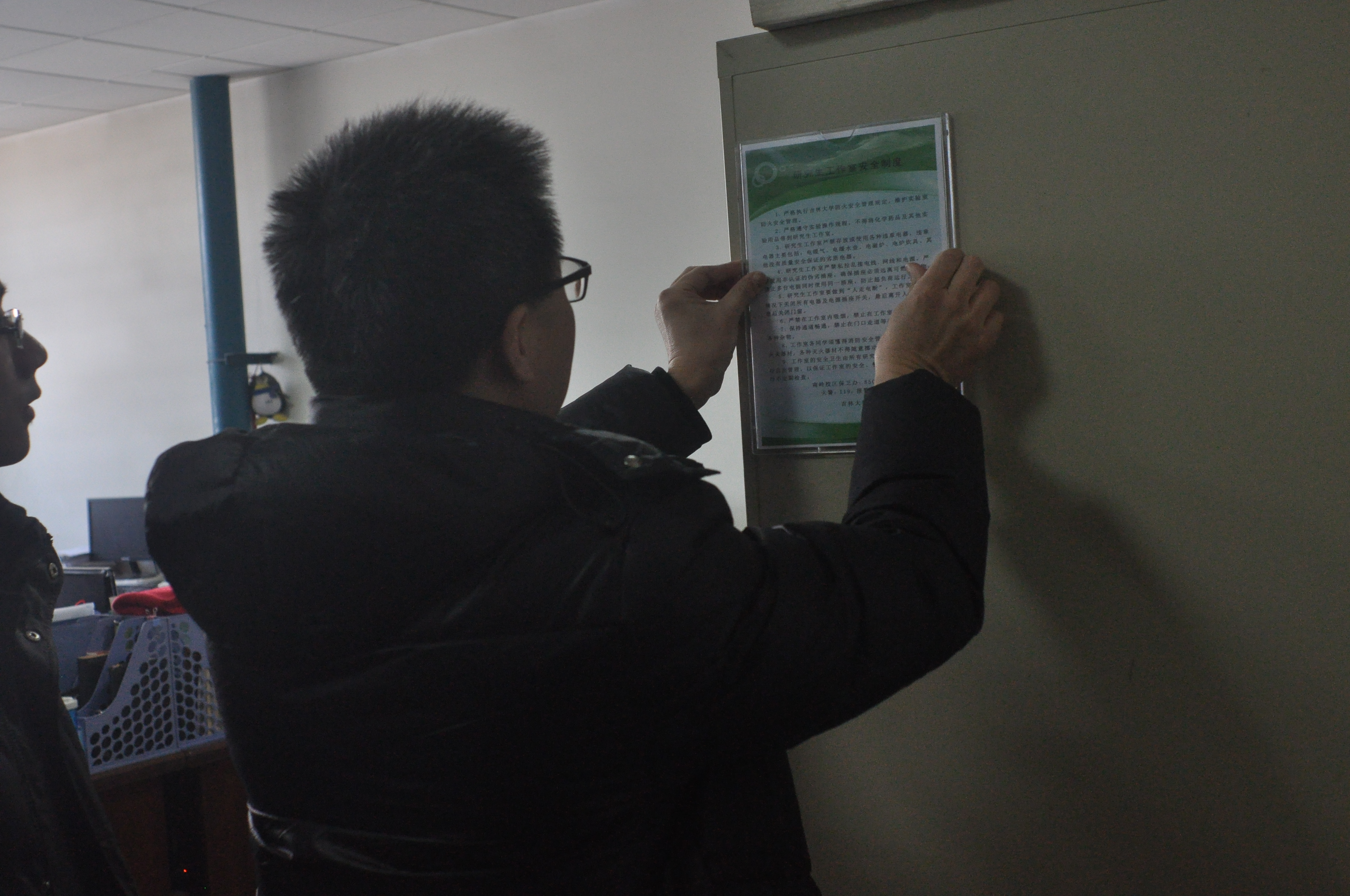 首先,研究生学团委向每个研究生工作室发放了扫把、垃圾桶、拖布等卫生清洁工具。其次,各研究生工作室在负责老师及学生党员负责人的带领下,张贴了《研究生工作室安全制度》及《研究生工作室信息统计一览表》,工作室每名成员填写并粘贴了个人卡片。最后,工作室每名成员认真检查了本工作室内存在的安全隐患,把室内物品进行了梳理,并打扫了工作室卫生,让整个工作室整洁了许多。