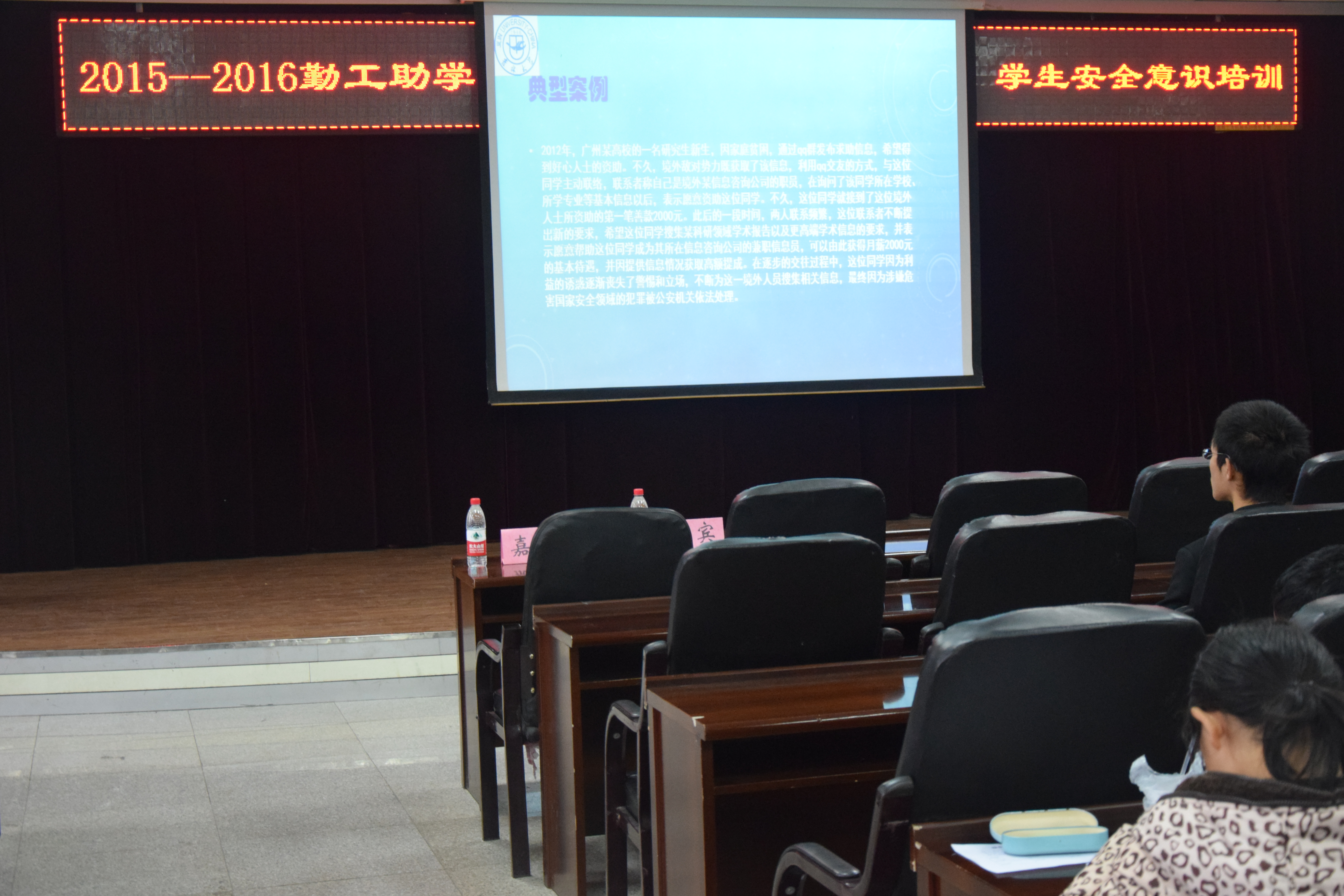 为使学生们熟悉国家安全的基本知识、了解社会案件发生的基本形式、特点和防范措施、明晰消防安全基本常识以及货场逃生自救的基本手段,熟知盗窃和网络诈骗常用的作案手段和甄别假中介,对其加强警惕意识,11月15日,由材料学院和东区勤工助学部联合举办的南岭校区勤工助学学生综合技能培训讲座在我校南岭校区逸夫机械材料馆八楼中拉开帷幕。东区保卫办治安科科长于珺老师和东区保卫办消防科科长韩旭老师担任本次活动的主讲嘉宾。