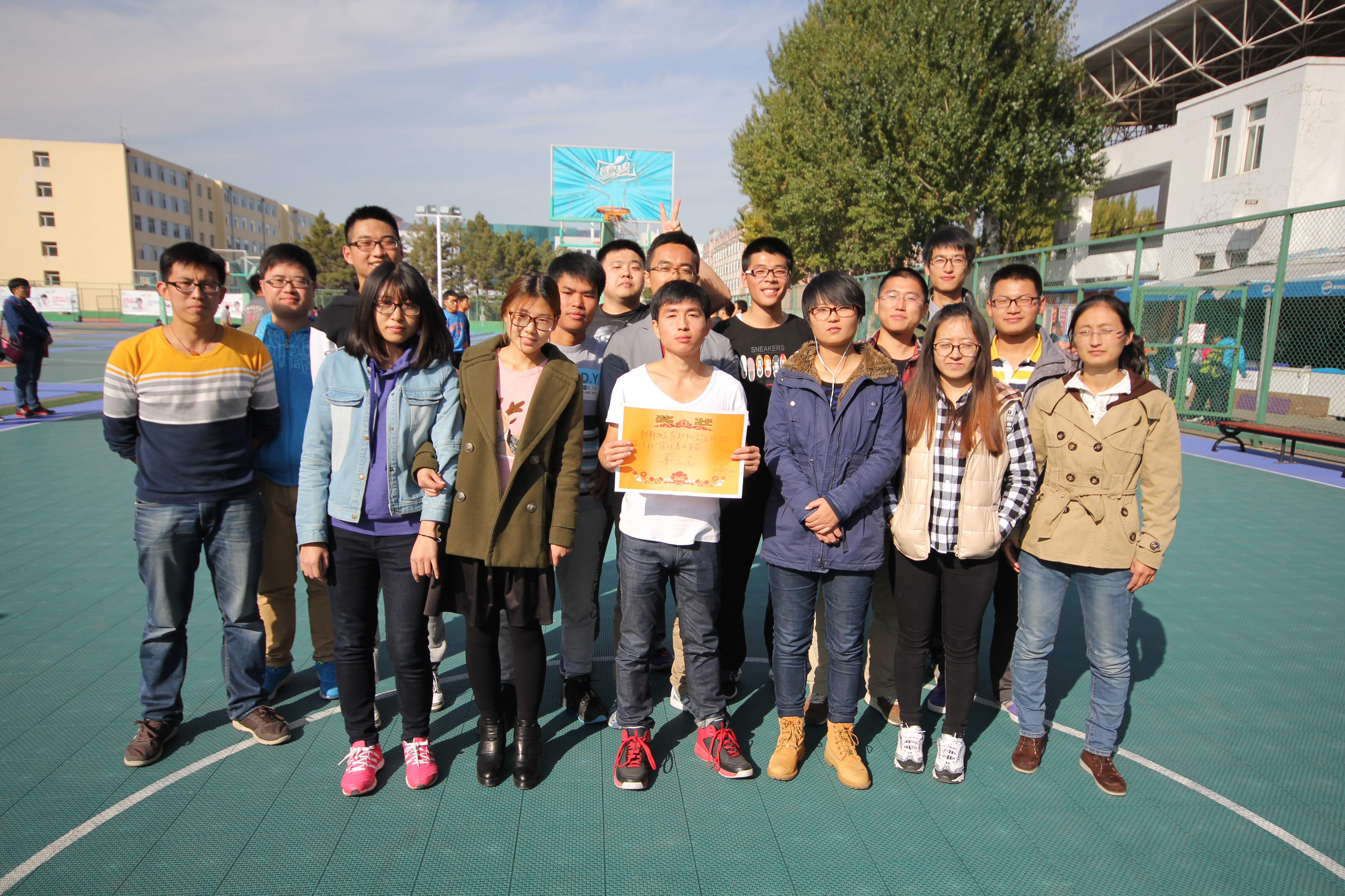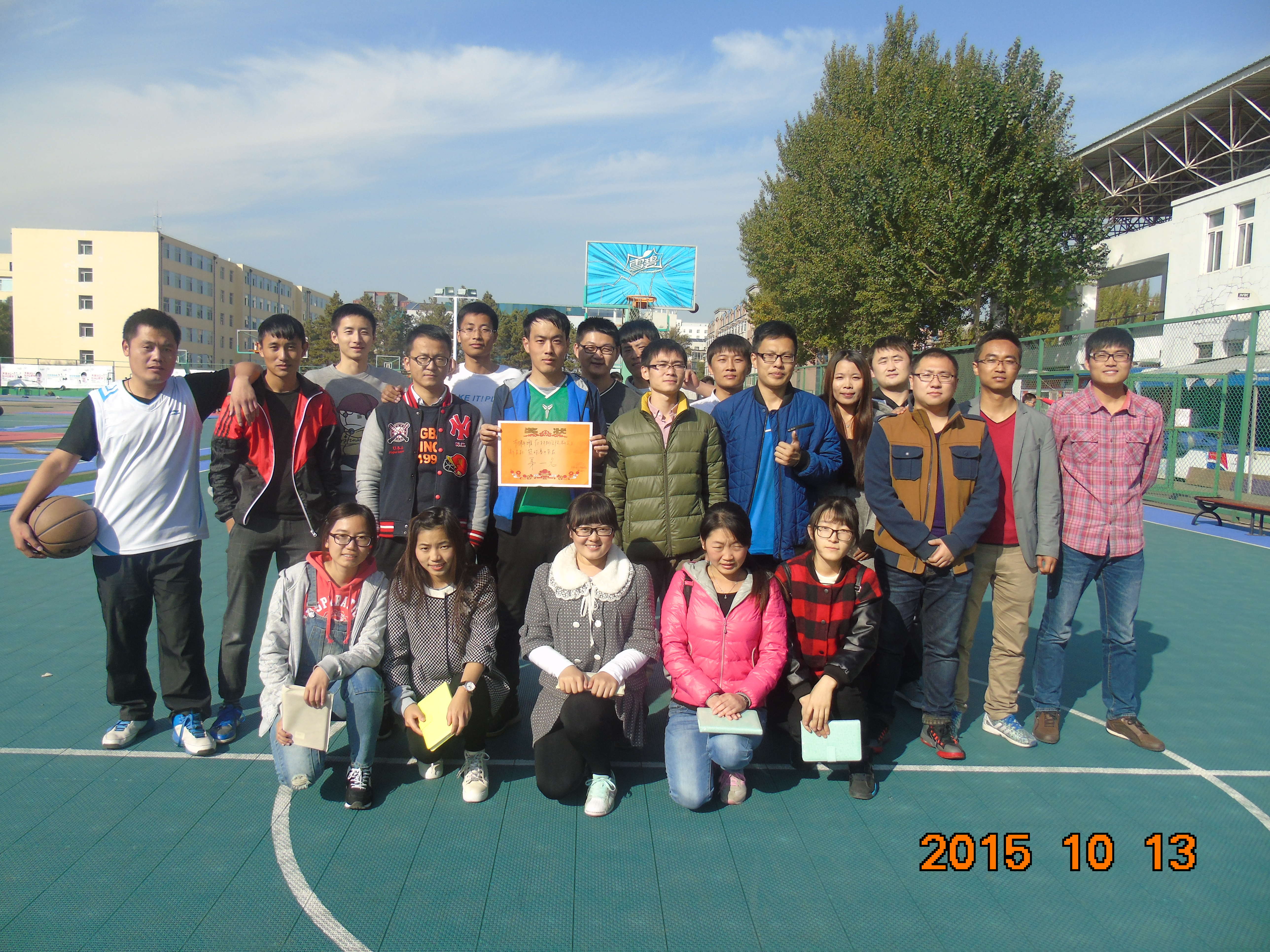 比赛结束后,主席团成员向各班级代表队颁发了奖品及奖状。各队队员以及拉拉队分别合影,留下了这值得回忆的一幕。此次篮球赛为刚刚入学不久的2015级硕士新生搭建了一个良好的交流平台,促进了同学之间的交流,为之后三年的研究生生活开启了积极健康快乐的序幕。