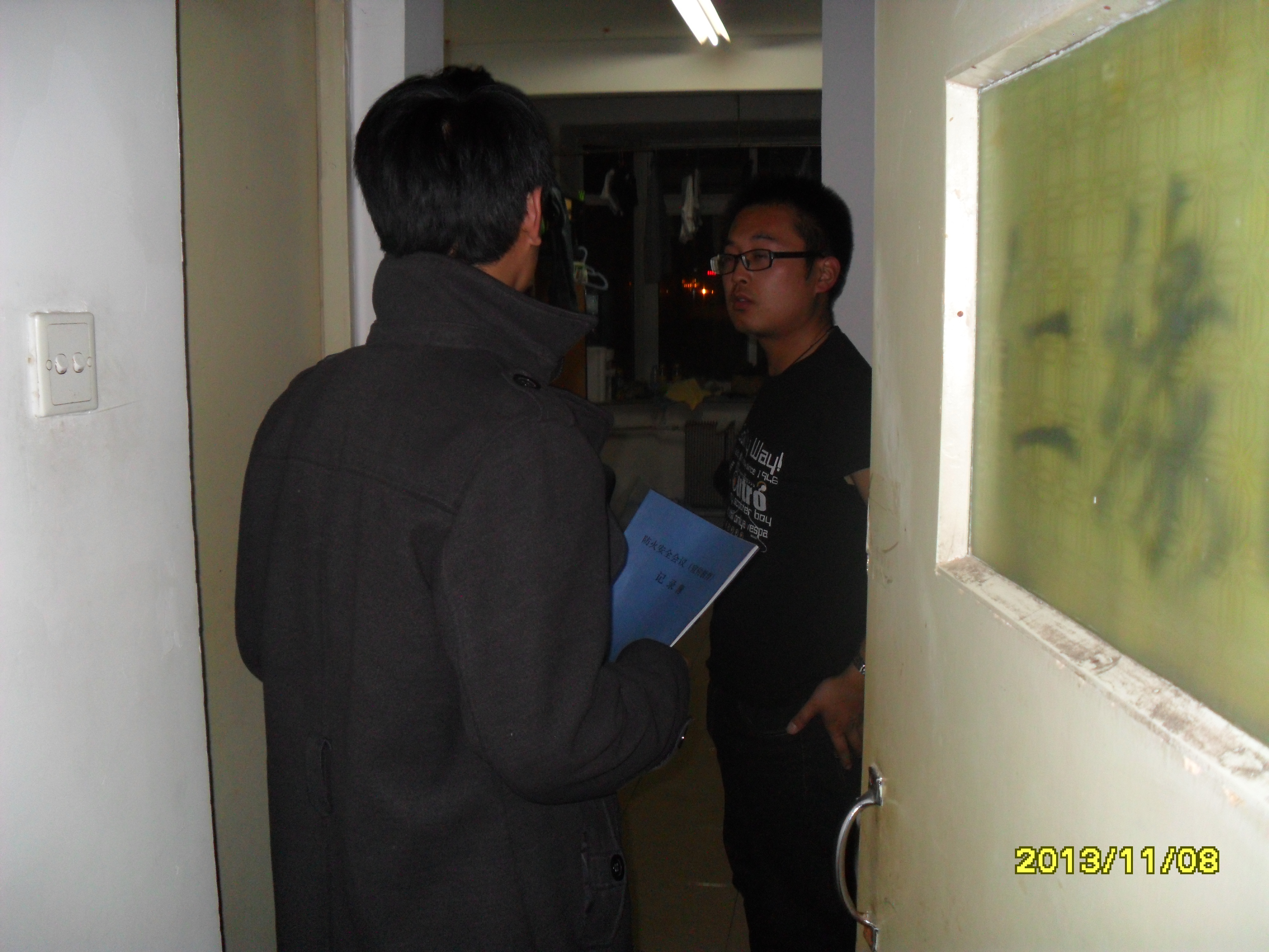 为维护寝室安全,给学生创造一个安全的学习生活环境,宣传防火安全常识并提高同学们的防火安全意识,我院于2013年11月9日,由研究生学团委生活部开展了冬季防火安全检查和防火安全知识普及宣传工作,院研究生学团委团委书记,学生会主席,生活部部长及部员参加了本次活动。