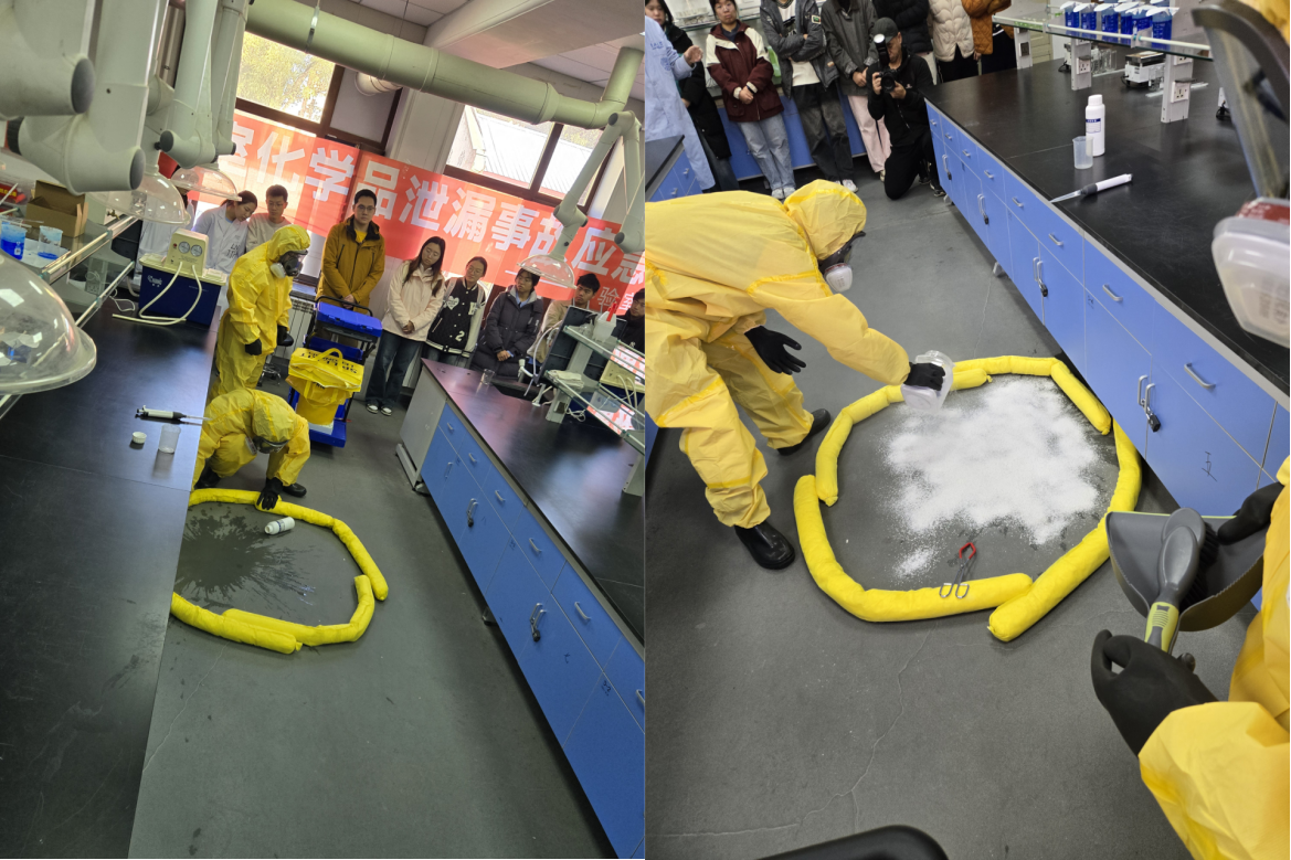 演练过程中,学校实验室管理处专家同步进行现场指导,围绕强腐蚀性化学品泄漏处置的核心要点、应急防护设施使用规范、个人防护装备正确穿戴等内容展开细致讲解,帮助参与师生厘清处置逻辑、规避操作误区;参与师生通过现场观摩、流程学习,进一步熟悉应急设备位置与基础使用方法,系统掌握强腐蚀性化学品泄漏的规范化处置流程,为后续实验安全提供知识与技能储备。