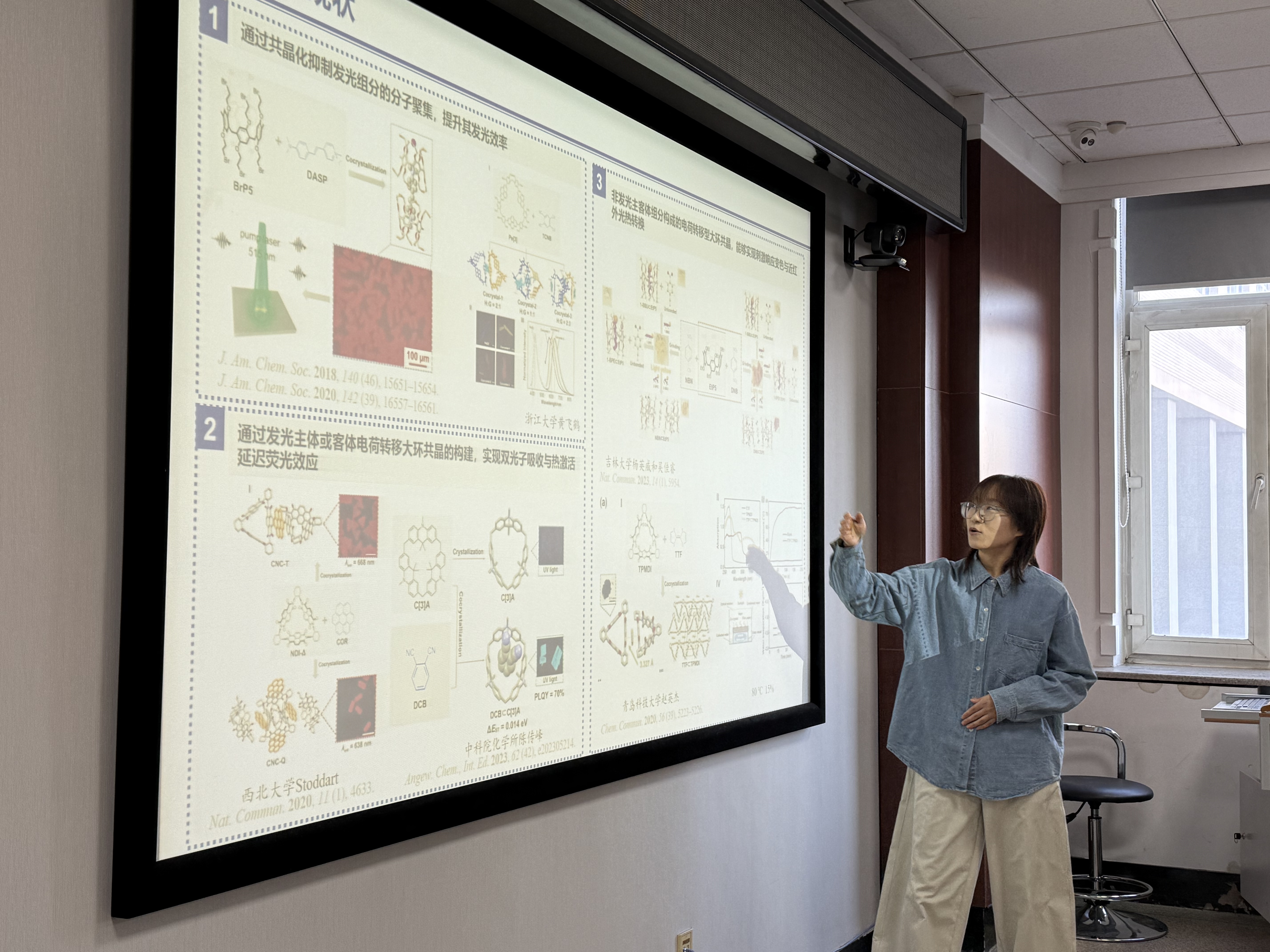 任素素同学分享的内容是关于有机共晶,其兼具独特功能与定制潜力,但多数存在结构静态、功能单一的局限。本报告聚焦传统有机共晶的挑战,介绍具有动态刺激响应性与新颖应用的新型大环芳烃基主客体共晶材料。
