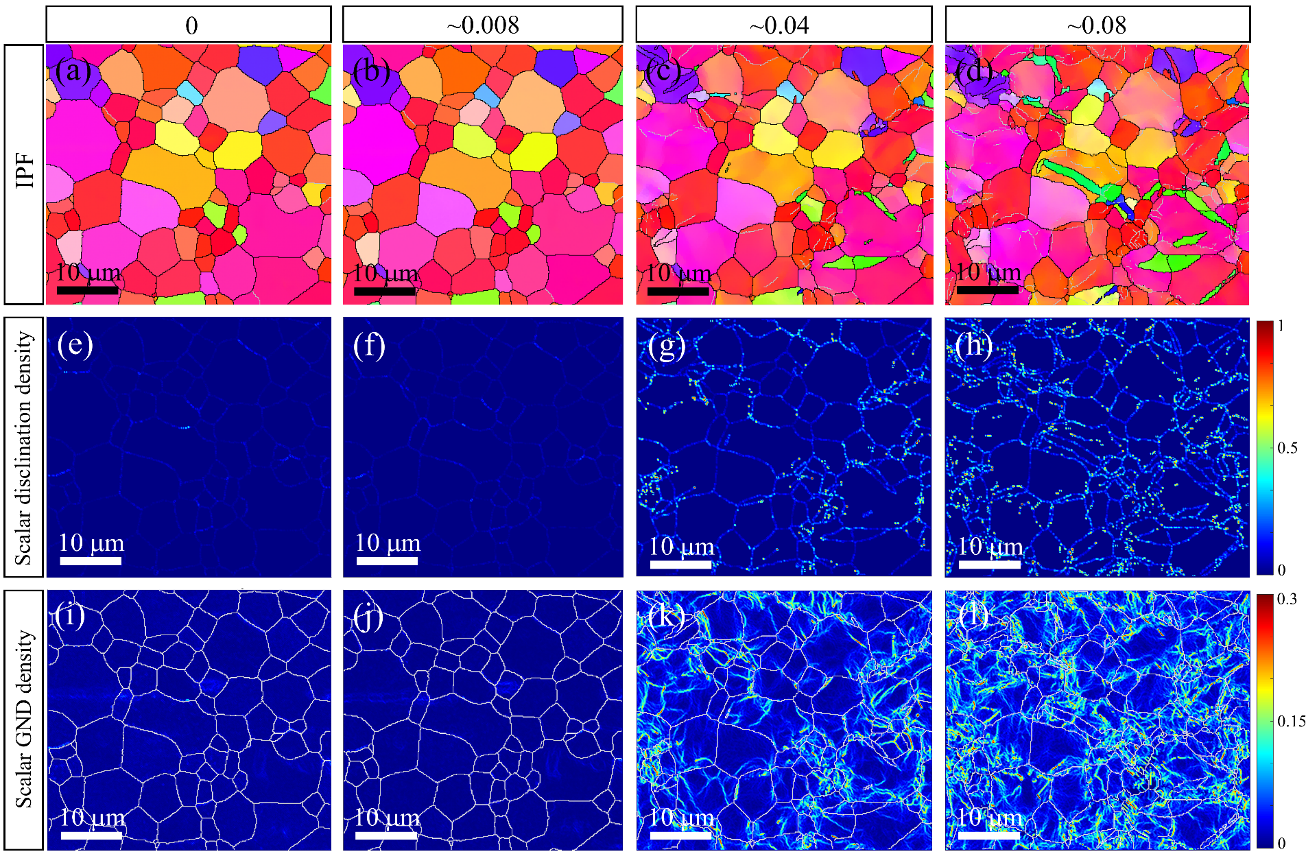 图1:(a-d) 晶粒取向图(IPF图),(e-h) 向错密度总量(以rad/μm²)为单位)图,(i-l) 几何必需位错密度总量(以rad/μm为单位)图,分别对应(a, e, i) 退火样品,(b, f, j) 0.008应变样品,(c, g, k) 0.04应变样品和(d, h, l) 0.08应变样品。在IPF图中,2°到15°之间的晶界以灰色绘制,大于15°的晶界以黑色绘制。