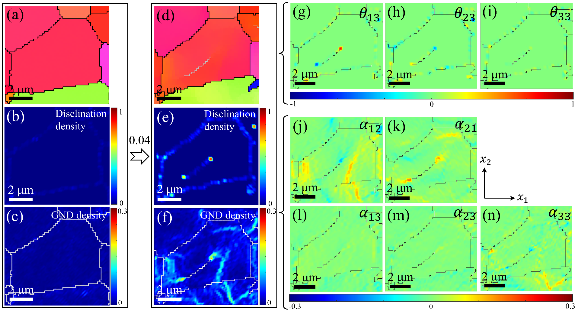 图2: 由晶内位错重新排列形成的不全向错:(a, d) 退火样品和0.04应变样品的晶粒取向图(IPF图),(b, e) 相应的向错密度总量(以rad/μm²为单位)图,(c, f) 相应的位错密度总量(以rad/μm为单位)图。在IPF图中,2°到15°之间的晶界以灰色绘制,大于15°的晶界以黑色绘制。(g-i) 0.04应变样品的向错密度分量θ13、θ23和θ33(以rad/μm²为单位)图,(j-n) 0.04应变样品的位错密度分量α12、α21、α13、α23和α33(以rad/μm为单位)图。