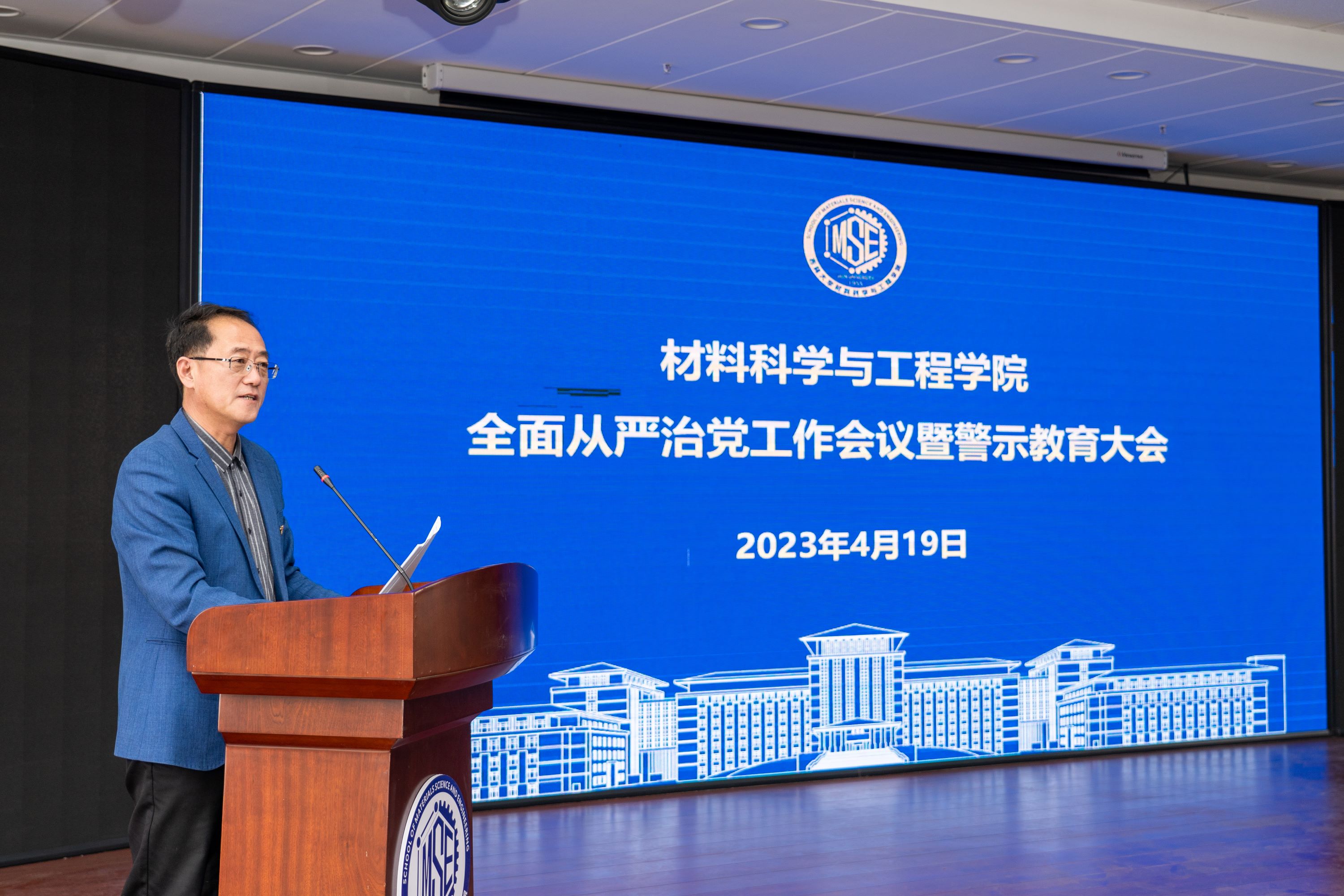 在材料馆八楼报告厅召开2023年全面从严治党工作会议暨警示教育大会。