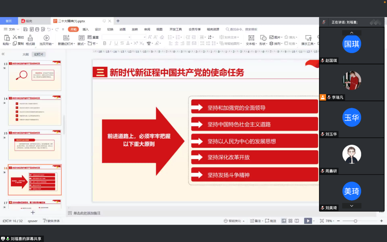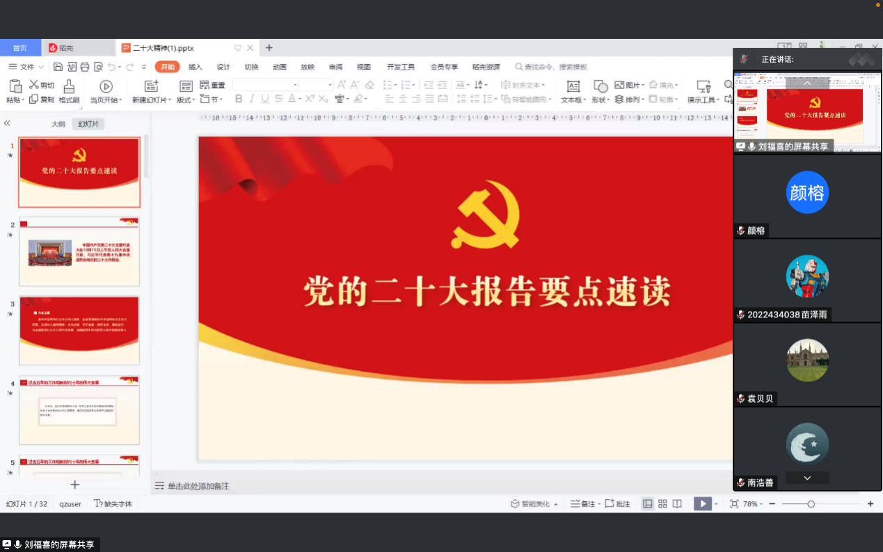 材料科学系硕士学生支部于线上召开“学习二十大,勇担民族复兴之使命”专题党课,学习贯彻党的二十大精神,深入学习习近平总书记在党的二十届一中全会上的重要讲话精神。支部书记李瑞凡主持会议并发言,支部委员刘福喜作主题汇报。支部31名党员全部参会。