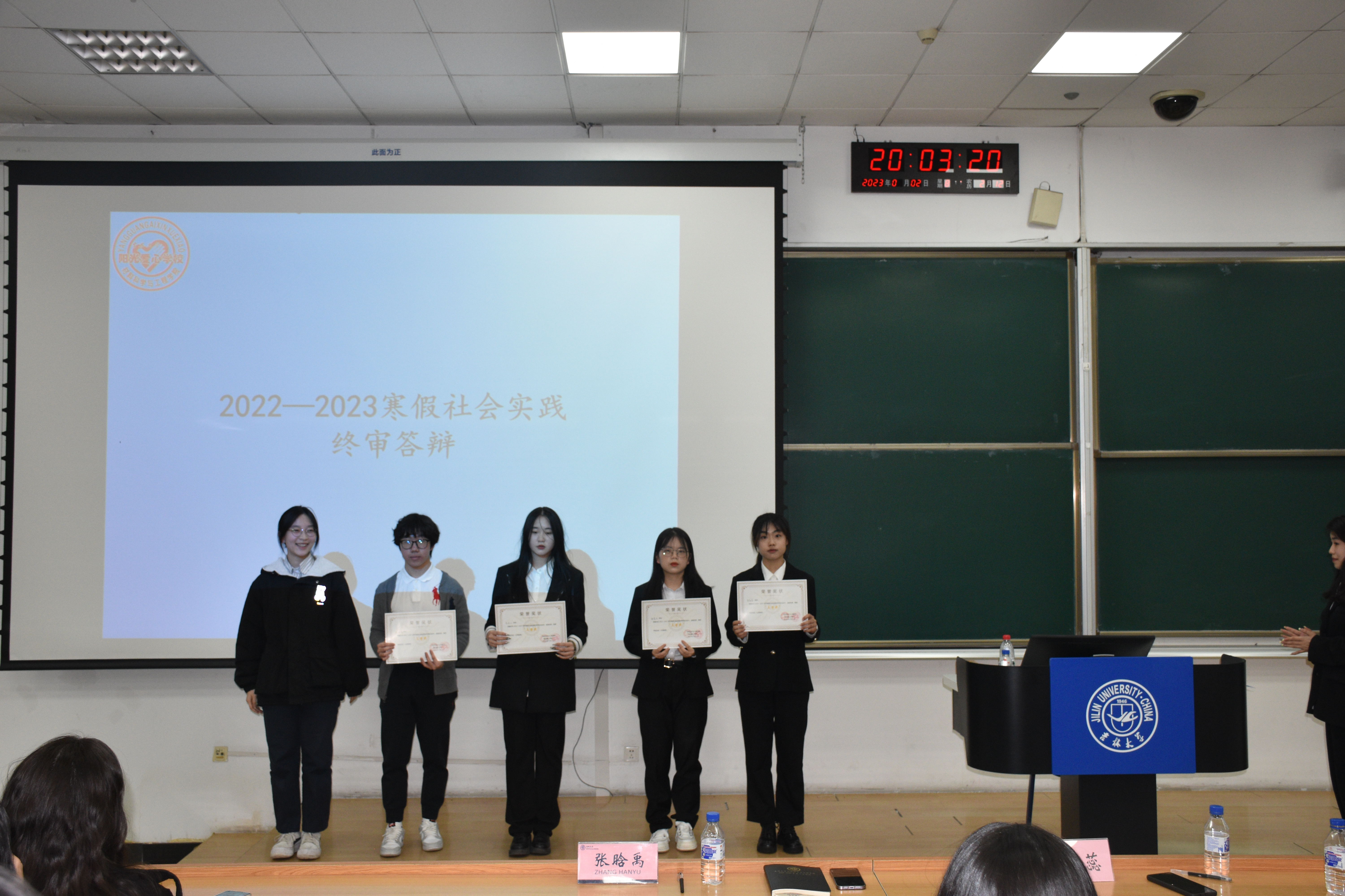 在说明答辩规则并示范后,主持人宣布答辩会议正式开始。在社会实践初审中脱颖而出的十位同学,依次通过幻灯片展示和精彩的演讲,汇报了寒假实践活动的历程与感悟。他们的实践主题包含“千人千团进校园”“乡村振兴实地调研”等,实践内容丰富,社会意义深远,在呈现红色文化的同时,传递社会实践的核心价值,薪火相传生生不息。各位评委根据评分细则为每位选手的答辩进行评分,并由工作人员进行汇总分数与排名。在接下来的颁奖典礼上,各位评委为获奖同学颁发荣誉证书。通过这次活动,同学们更加体会到了本次寒假社会实践活动的意义。此次寒假社会实践终审答辩会在同学们的掌声中完美落幕。