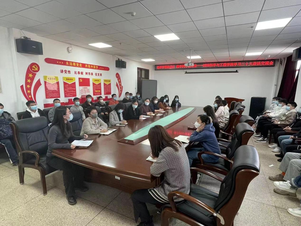 会议由王晗老师主持。首先,全体参会成员共同观看了二十大报告解读的视频,回顾了新时代十年的非凡成就与伟大变革。2022级七班班主任张霏霏老师和李莉莉老师相继为同学们分享了她们自己学习二十大的心得体会。与会老师针对同学们提出的问题与困惑给予了解答,勉励同学们要在学业发展、学团活动、科研实践等活动中不断明晰自己的方向。最后由华蕊老师总结发言,引导新时代大学生培养能吃苦的品格,激励同学们努力学习、积极进取,发挥自己的个人优势和特点,借助学校和学院的良好平台,实现自己的梦想和追求。随后,全体与会师生在材料馆410合影留念。