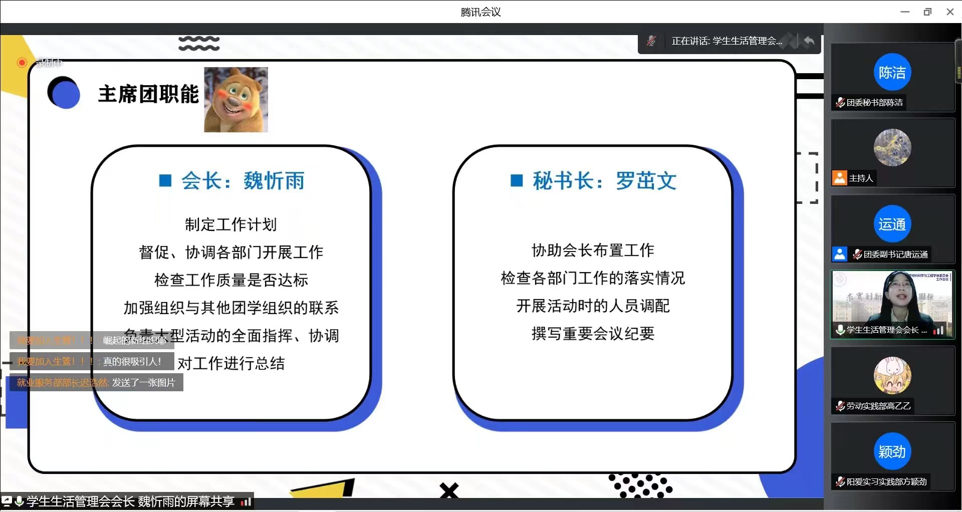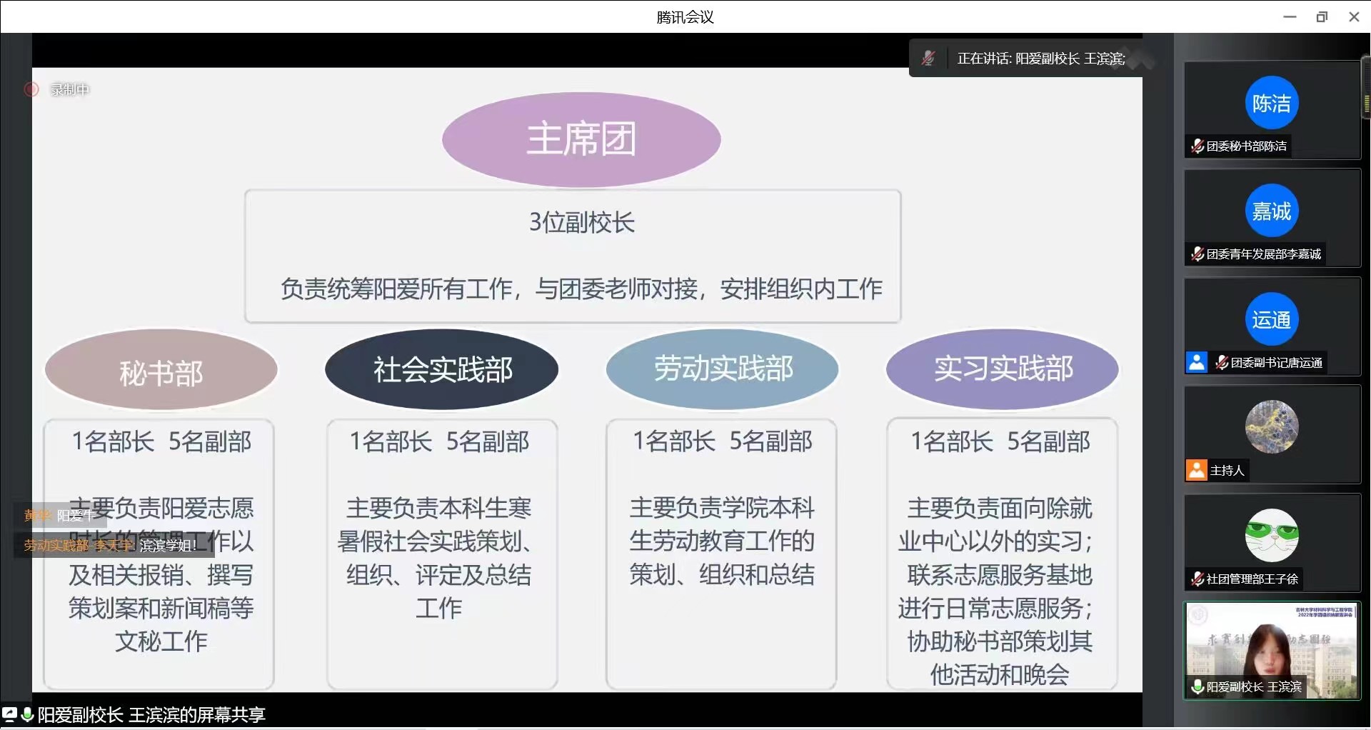 为了壮大学团组织工作人员队伍,进一步发现人才、培养人才,为更多的同学提供展示的舞台和锻炼的机会,发挥学团组织作为学院与学生之间的桥梁纽带作用,黄色影片 学团组织于20221026日,面向2022级新生召开线上志愿者招募宣讲会。本次宣讲会由黄色影片 基层团委、学生会、阳光爱心学校、新媒体中心、学生生活管理会联合举办。学院团委负责人、2022级兼2020级辅导员王晗,材料物理专业辅导员张晗禹,各学团组织主席团成员和部门负责人参加本次宣讲会。