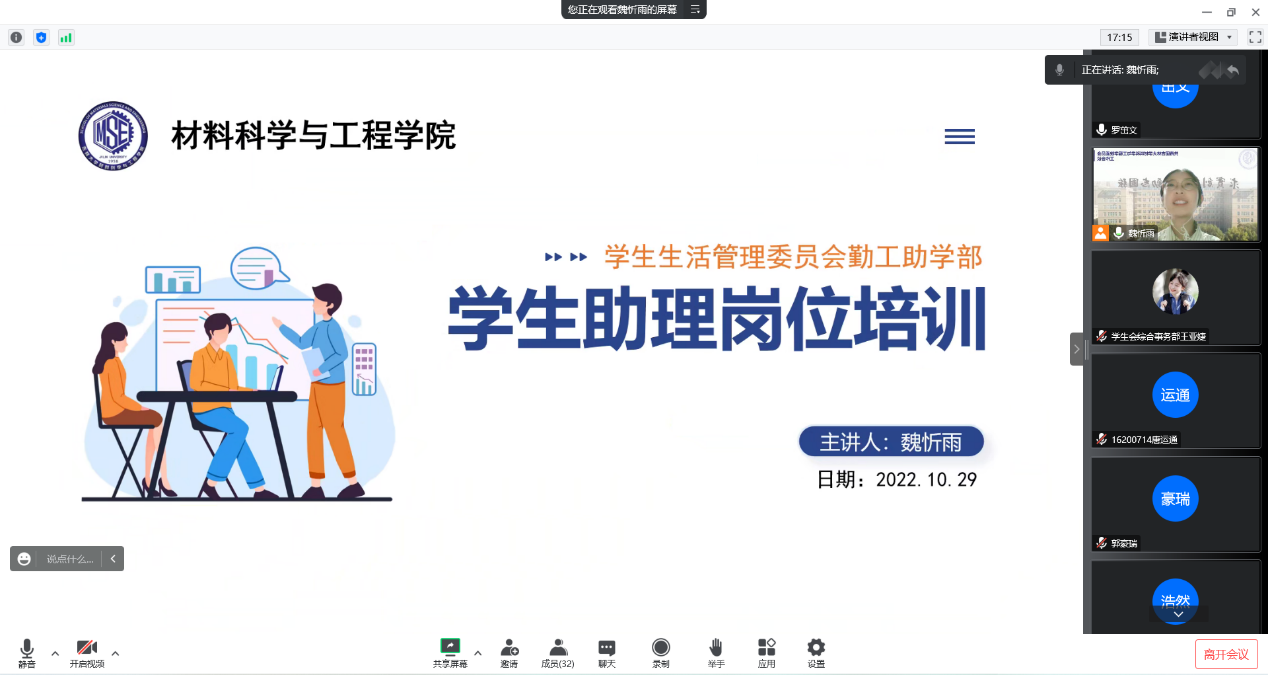 为进一步帮助学生助理明确工作职责,端正工作态度,更好地协助老师们完成工作,2022年10月29日晚九点,黄色影片 组织开展勤工助学岗位助理培训会,本次会议由学院学生生活管理会勤工助学部部长魏忻雨主持,全体学生助理参加培训。