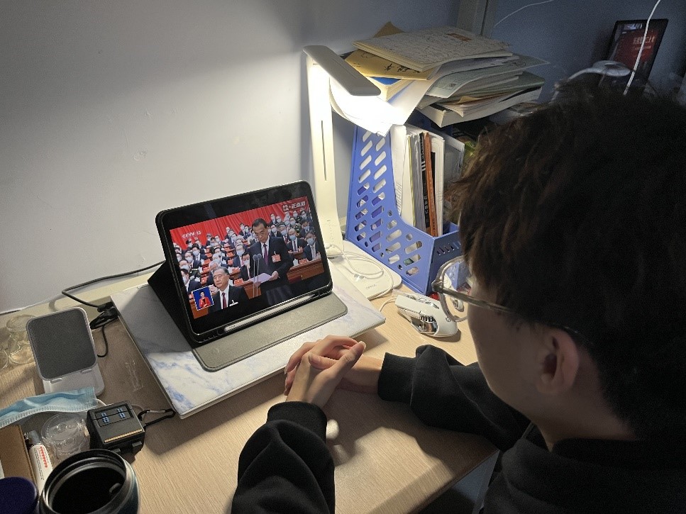 同学们跟着总书记的报告回顾了上一个五年发展阶段党的工作和新时代十年的伟大变革,又在政治、思想、民生、军事、外交等方面领会了党中央擘画的发展蓝图。总书记在报告中说到:“青年强,则国家强。当代中国青年生逢其时,施展才干的舞台无比广阔,实现梦想的前景无比光明。”这让同学们备受鼓舞,要将报告精神融入到自己的学习生活中。立志以时代为己任、以国家宏图为目标,刻苦学习,扎实工作,以一往无前的姿态全面发展,成为社会主义接班人和建设者,谱写新时代中国特色社会主义更加绚丽的华章。