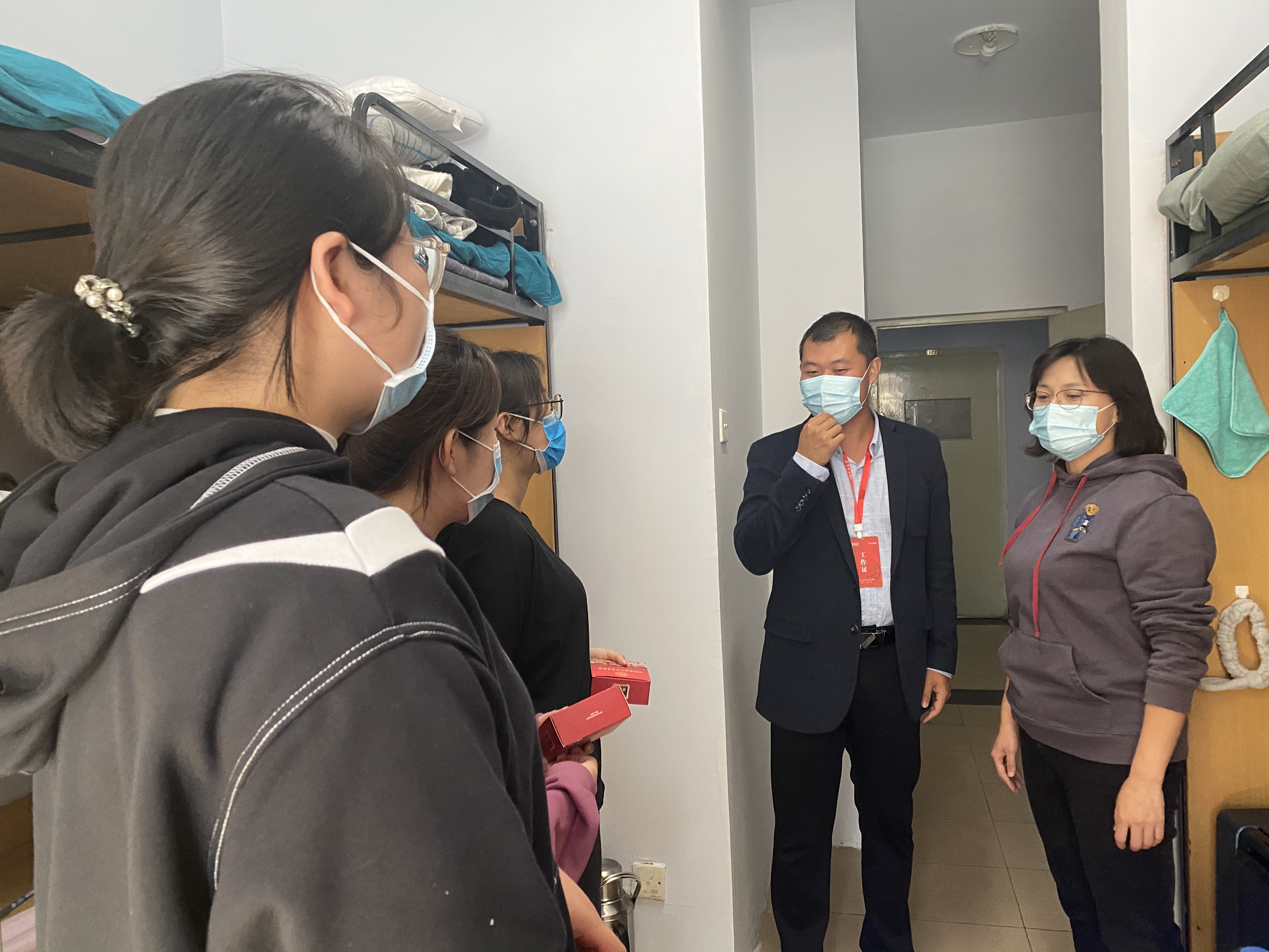 在走访过程中,学院领导向新生们表达了学院的问候和关怀,为2021级同学分发月饼和苹果,并与新生们亲切交谈,仔细询问新生在学校衣、食、住、行各方面的问题,认真聆听学生对学校环境、学院迎新工作的感受,详细了解每位新生的基本情况和入学报到后的体会。