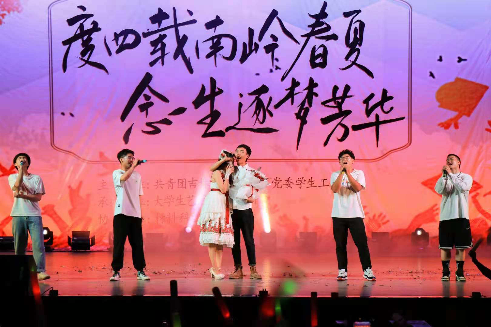 下午7时许,晚会在东区艺术团無乐队一首摇滚版《国际歌》的音浪中开场,带动了场下观众的情绪。接着是毕业生舞蹈《没有明天》,他们以灵动的舞姿跳出了青春激荡的热情与朝气,吸引了观众的眼球。声乐团带来的《我的未来式》表达了当代青年学生对未来的憧憬与向往。随后,两段街舞《like it》和《通关密码》用动感的音乐和演员们热辣的舞姿,将晚会气氛推向高潮。引人动容的器乐演奏《时空的向往》后,相声《我们这四年》以诙谐幽默的语言,带着同学们回忆起这四年的酸甜苦辣,使现场观众时而感动,时而欢笑。接踵而至的民族舞《国色》、歌曲《云与海》、《夏天的风》、《给所有知道我名字的人》无不精彩纷呈,演员们在欢快的节奏,跳跃的音符中展现出大学生的青春活力,赢得场下一阵阵喝彩。随后,在歌曲《星辰大海》的陪衬下,南岭校区各学院毕业年级辅导员们上台为毕业生们献上了最真挚的祝福。晚会临近尾声,最后一个节目是由南岭合唱团带来的合唱《梨花又开放》和《明天会更好》,晚会在合唱团高亢激昂的歌声中圆满落幕。