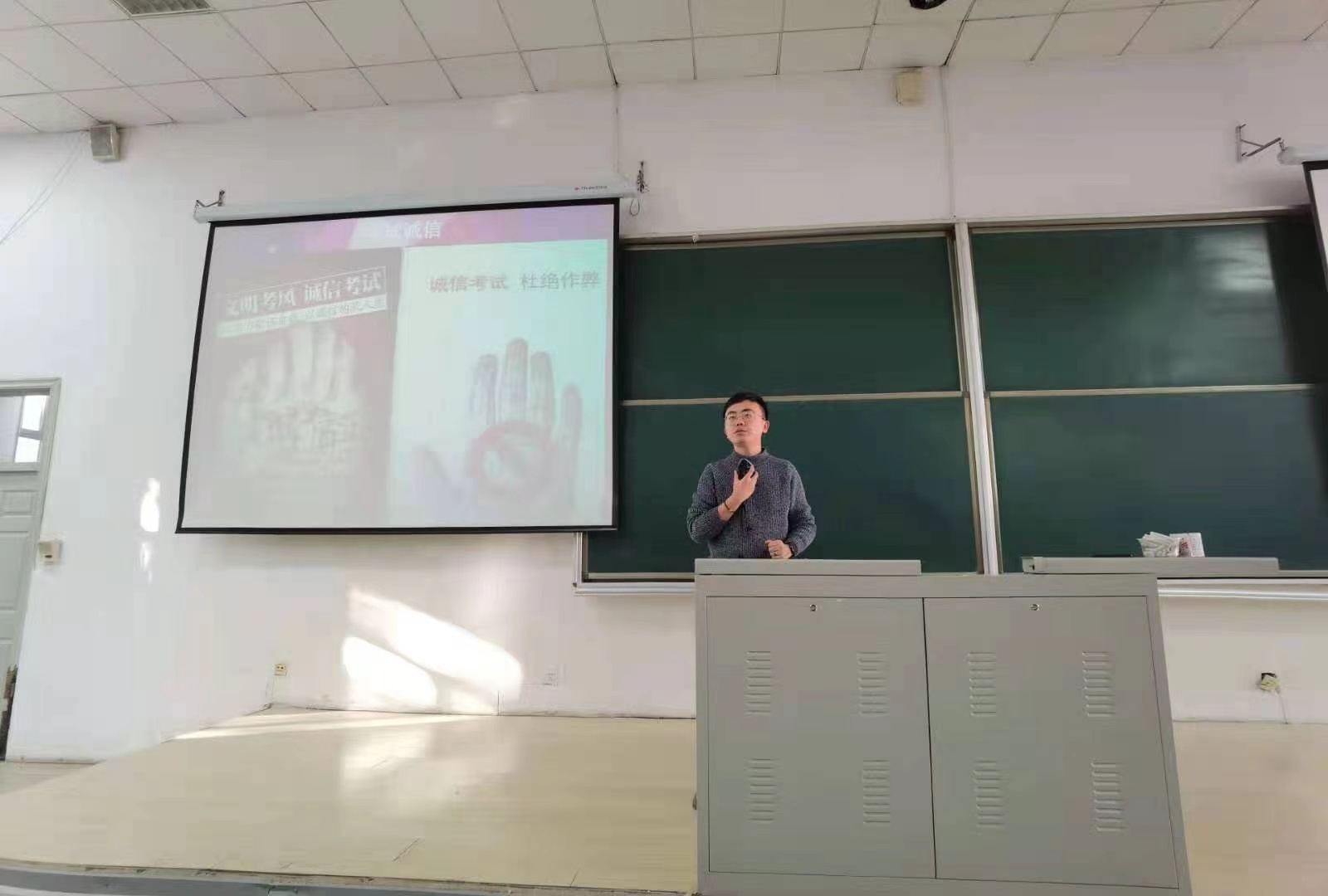 会议伊始,佟昊天老师为同学们敲响警钟,重点宣读了考试要求条例,讲解了学校对考试作弊行为的认定和处理办法,告诉同学们考试舞弊的严重后果,要求同学应该端正考试态度,构建诚信校园。接下来由王晗老师强调考风考纪的要求,表明了我院对考试作弊等违纪行为绝不姑息的态度,使同学们认识到考试违纪行为的危害性和严重性,希望同学们可以诚信对待考试,自觉遵守考试要求,树立诚信意识,诚信作风。最后两位老师叮嘱同学们要学会疏解考前的心理压力,积极备考,诚信考试。