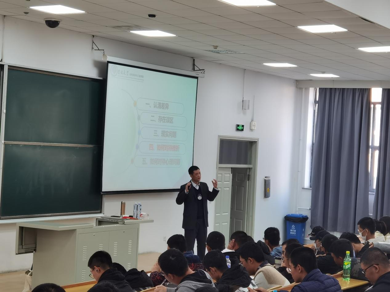 首先,李东生书记从亲情、友情、爱情、师生情四个方面阐述了人际关系的定义,告诉同学们要珍惜每一份纯正的感情,在大学期间要正确认识自己的情感变化,妥善处理人际关系。李书记通过列举光环效应、投射效应、刻板印象等常见的心理效应,指出大学生在建立人际关系时不能盲目,每位同学都要认清自我,了解自己的所长所短,与自己信任的人、敬佩的人建立友谊。其次,李书记强调了人际交往中存在的一些问题,例如不懂自尊、心胸狭隘、不守信用,告诉同学们面对这些问题时不要回避,并结合自身的经历,提出正确的应对方法以及交往方式,为同学们提供宝贵的经验。随后,李书记指出大学生人际交往的原则,并希望每位同学都能做到积极、真诚、守信、平等、适度、理解、包容。此外,李书记还告诫同学们在面对差异时,要尊重别人的处事模式;在遇到矛盾时,要理解别人的观点立场;在受到伤害时,要宽容别人的细微过失。