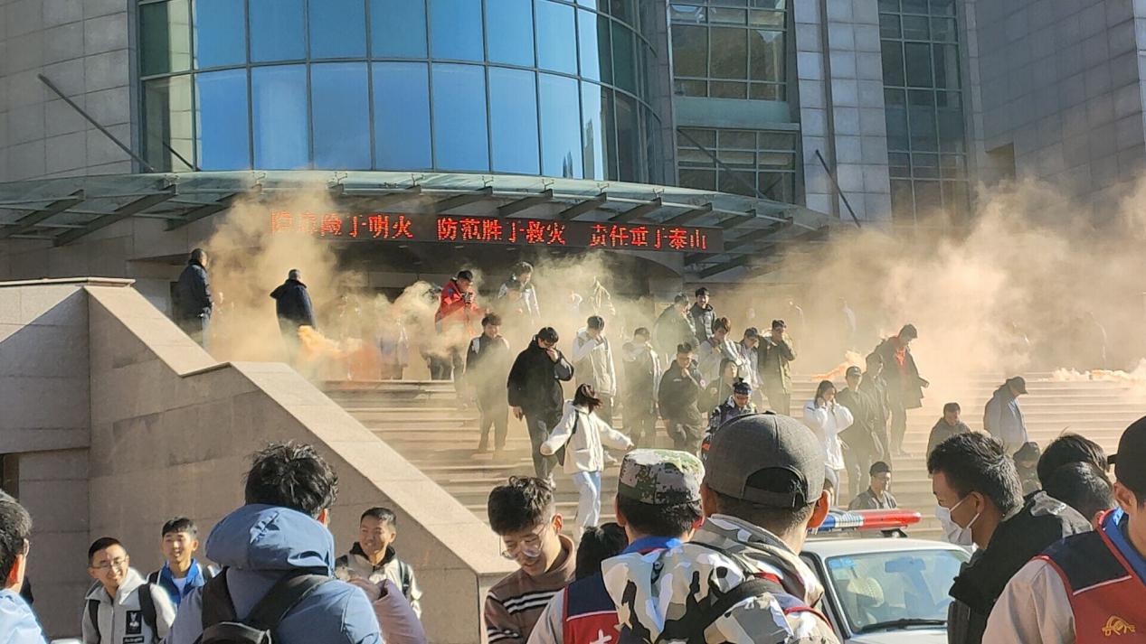 本次活动是由南岭校区各学院及相关单位联合开展。活动开始前十分钟相关工作人员打开逸夫教育大楼一楼所有安全通道,电梯运营商停运所有电梯,为活动开展提供了安全保障。9日上午11:40活动准时开始,逸夫教育大楼各个楼层弥漫着提前准备的发烟装置散发的模拟浓烟,警报声中,疏散组织人员组织上课以及自习的学生掩护口鼻紧张有序地从各个安全出口快速逃生。随后,从出口疏散的同学集中于逸夫教育大楼前的展板宣传场地,由黄色影片