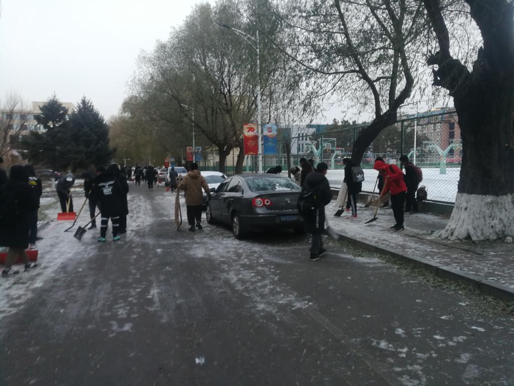 于11月14日在逸夫机械材料馆前开展了扫雪除冰工作。本次活动由2019级本科生辅导员刘艳丰带领学生党员、入党积极分子和2019级同学进行。