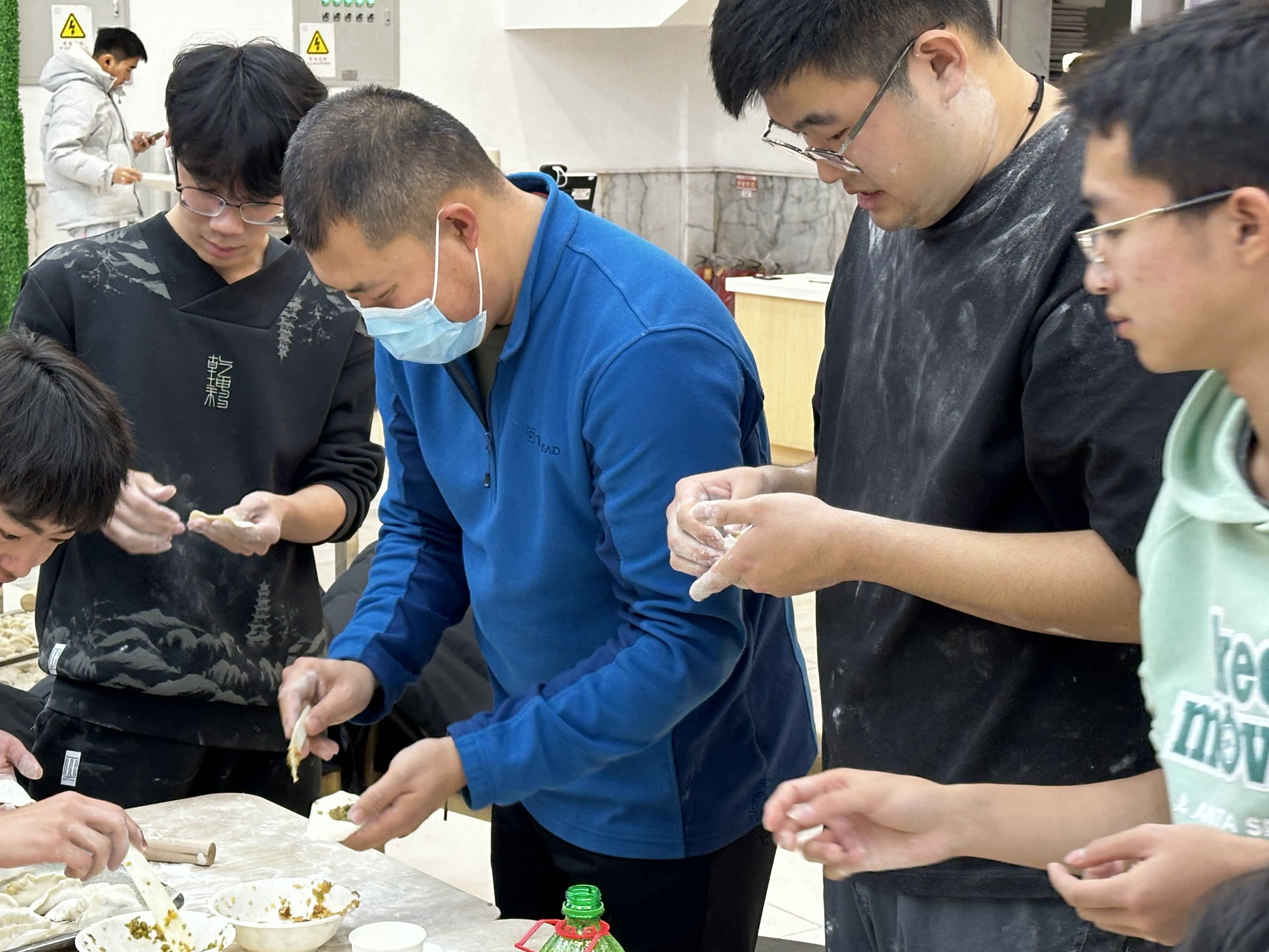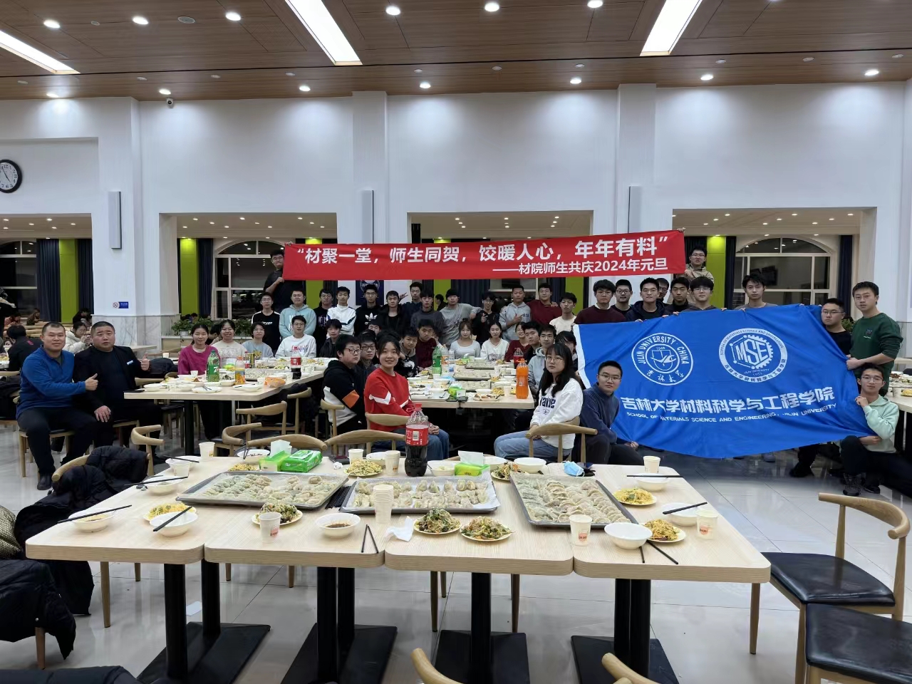 在活动过程中,同学们互相帮助、互相学习,不仅提高了自己的动手能力,也增进了彼此之间的感情。同时,通过这次活动,大家也更加深入地了解了中国传统文化,感受到了浓浓的新年氛围。为了增加活动的趣味性,现场还悬挂了“材聚一堂,师生同贺,饺暖人心,年年有料”的横幅,为活动增添了不少节日气氛。