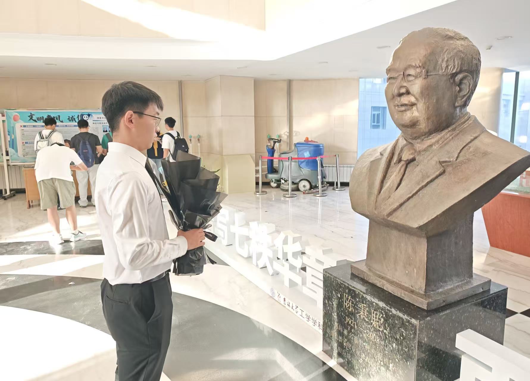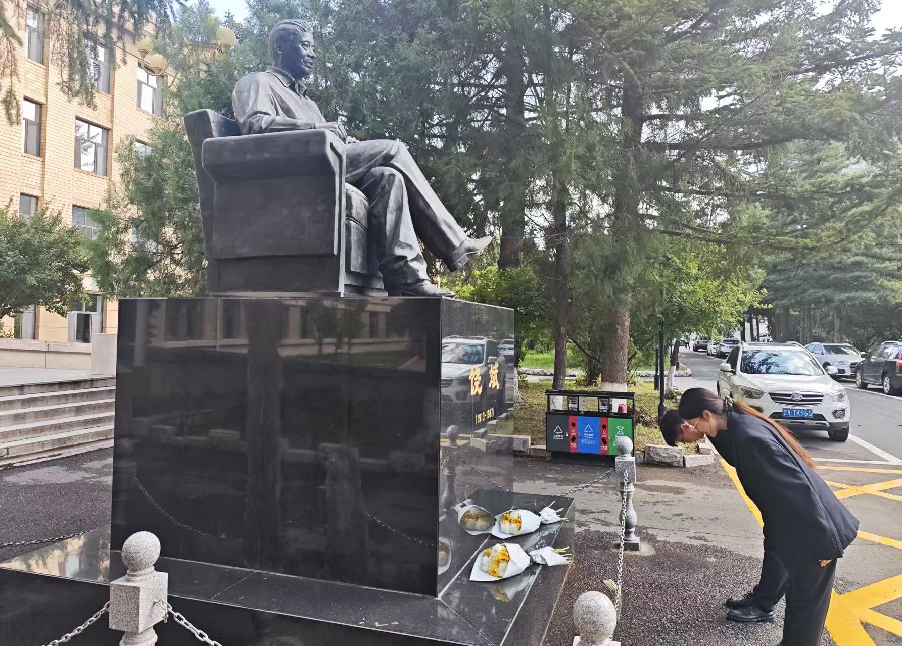 学生代表手持鲜花,神情肃穆,缓缓走向雕像,献上鲜花并鞠躬致敬。随后,全体代表来到位于逸夫楼的陈秉聪先生雕像处。陈秉聪先生,山东黄县人,是农业机械设计制造专家,也是中国地面车辆学术领域和汽车专业教育的开拓者。他先后参与筹建山东工学院和长春汽车拖拉机学院,是我国拖拉机专业的创始人,1995年当选为中国工程院院士 。陈秉聪先生一生致力于农业机械化研究与教育事业,为我国农业机械领域培养了大批专业人才,推动了农业机械化进程。师生们同样以献花、鞠躬的方式表达对陈秉聪先生的深深敬意。