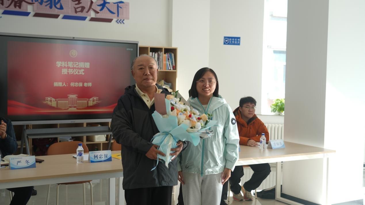 最后,梁策老师代表学院师生为何忠保老师献花。