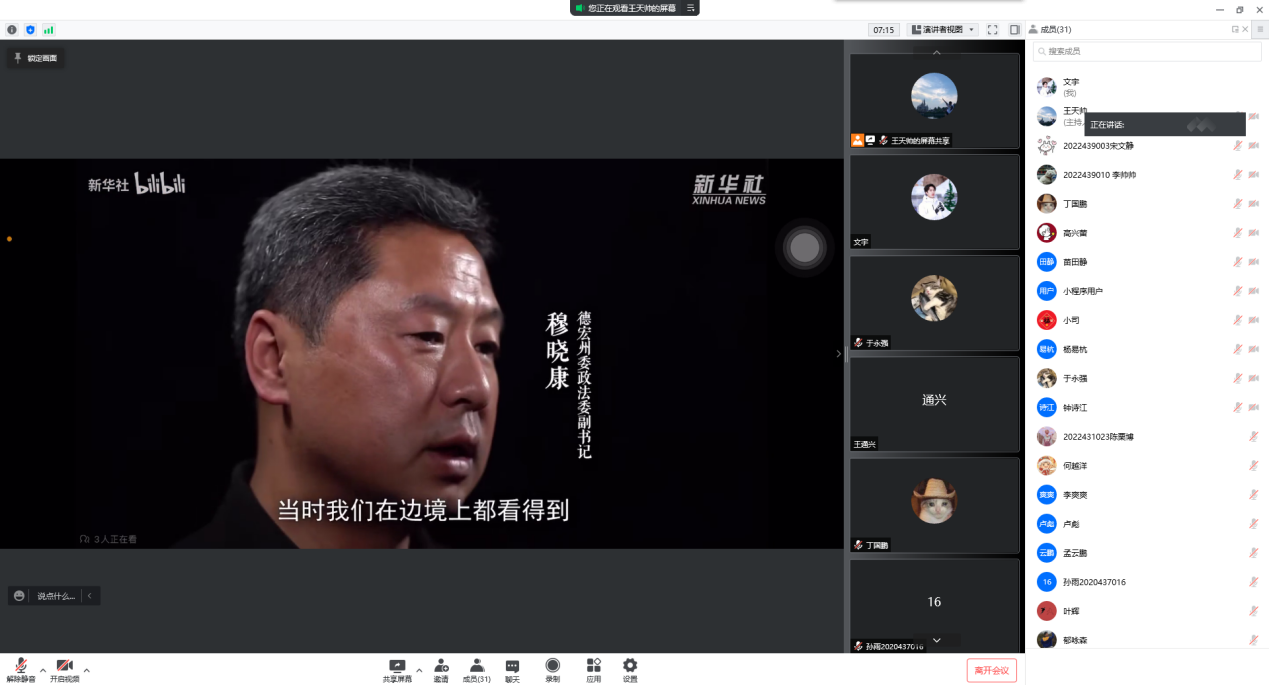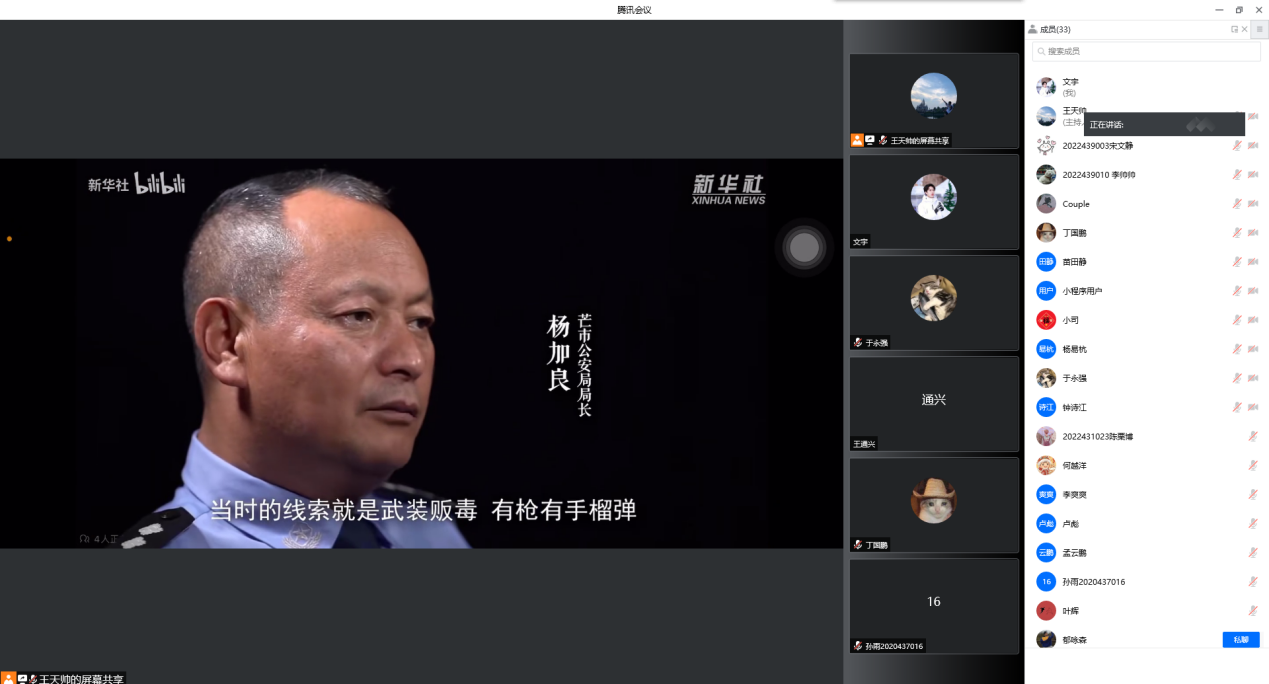 2022级博士班组织开展了“珍爱生命,远离毒品”禁毒主题班会,会议通过腾讯会议以线上的形式开展,2022级博士班的同学参加了此次会议,会议内容为观看题为“枪战、卧底、濒死...真实记录边境禁毒故事”的禁毒宣传纪录片。