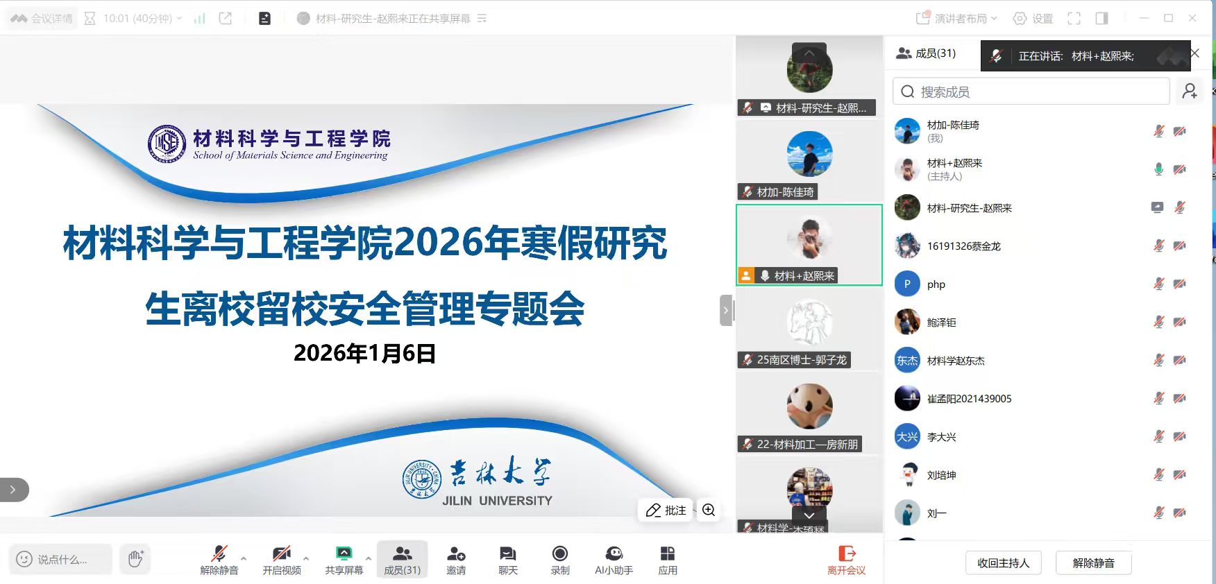 会上,赵熙来老师围绕寒假期间研究生离校、留校安全管理工作进行了重点部署。针对离校研究生,会议强调要严格落实离校申请与信息备案制度,准确填报去向、行程及联系方式,确保信息可追溯、沟通不断线;离校前要全面排查宿舍安全隐患,切断电源、锁好门窗,妥善保管个人及贵重物品;返乡途中应选择正规交通工具,增强交通安全意识和防诈骗、防盗窃意识,确保出行安全。