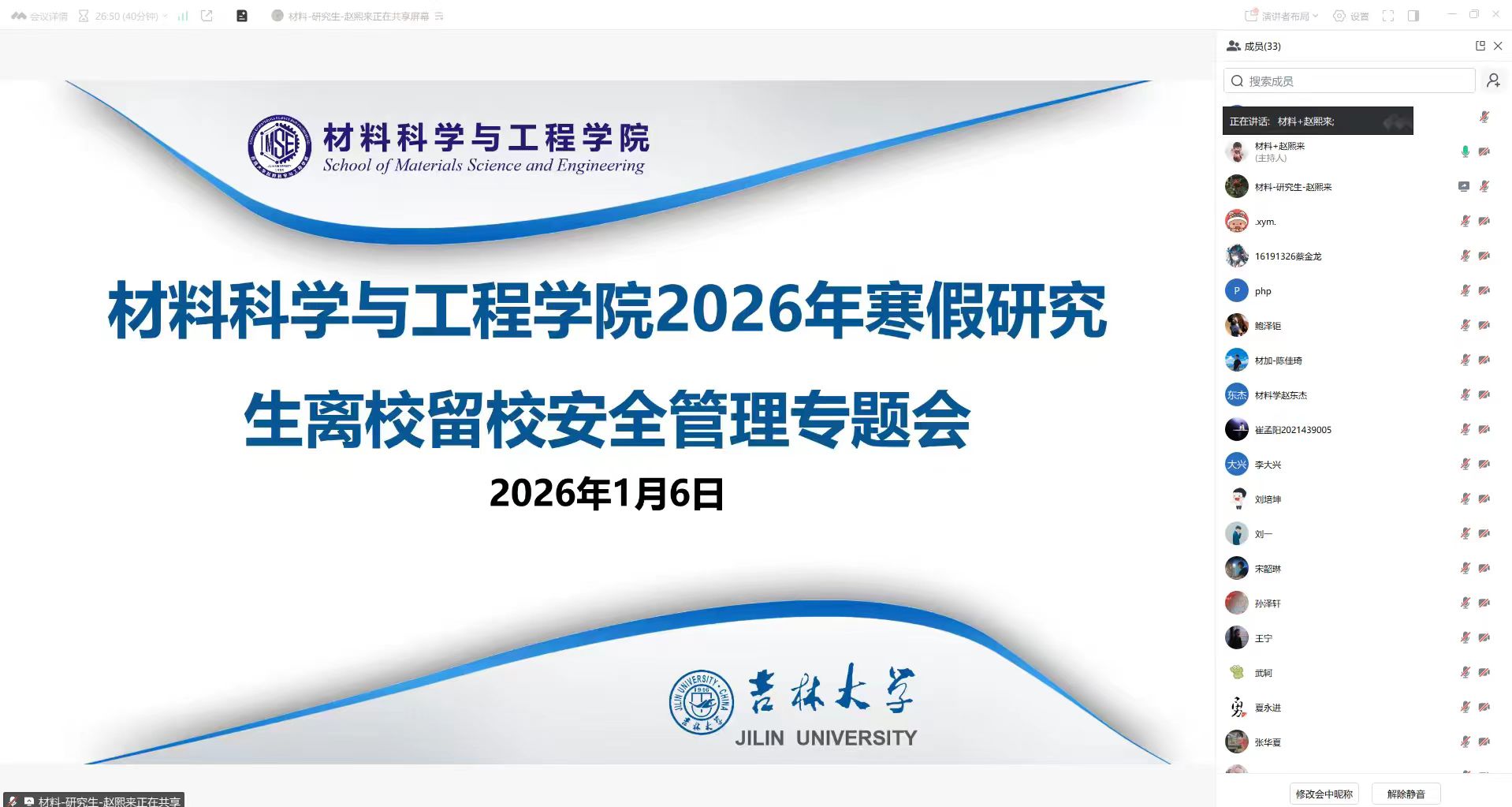 召开2026年寒假研究生离校留校安全管理专题会。会议由学院研究生辅导员赵熙来老师主持,全体研究生班长参加会议。